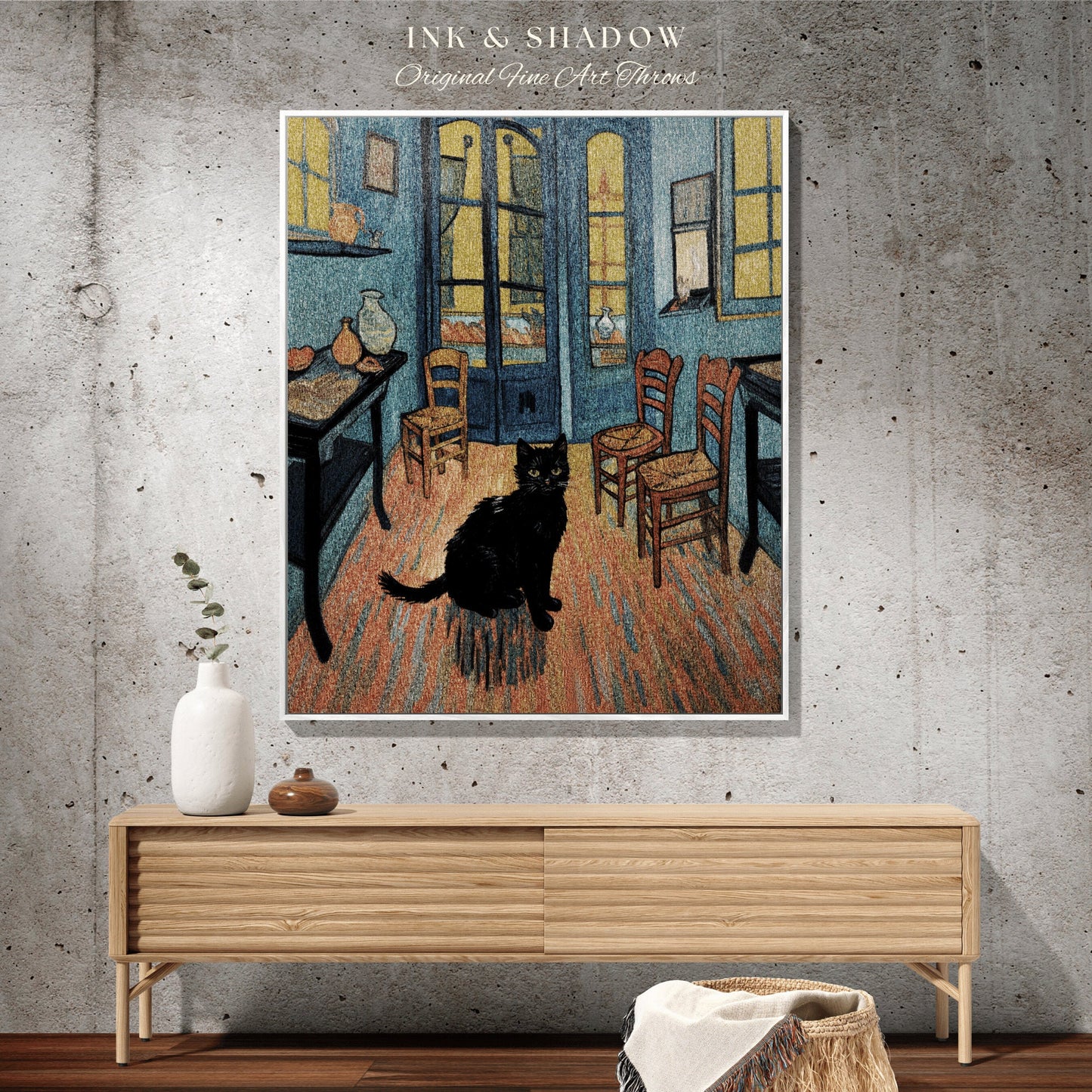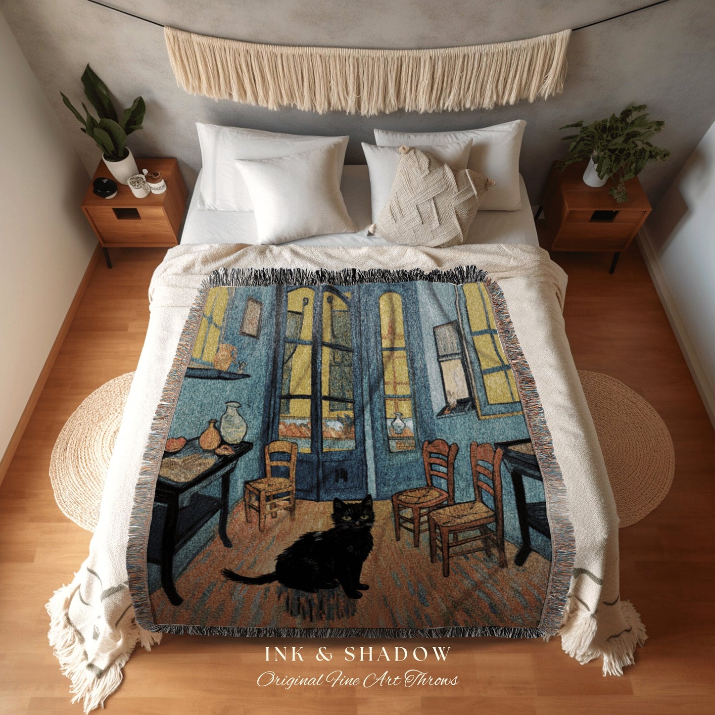 Black Cat Tapestry Blanket Woven Wall Hanging | Boho Room Decor Van Gogh Inspired Art Blanket | Funny Tapestry Black Cat Decor Whimsical |