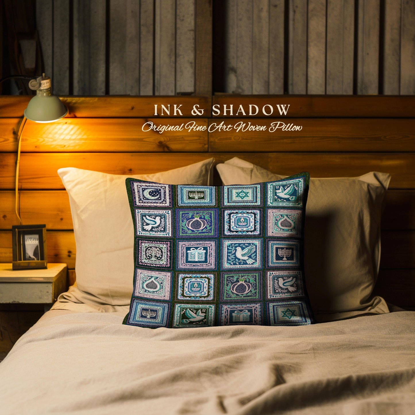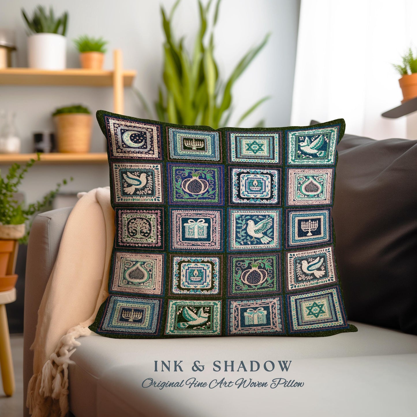 Bohemian Jewish Folk Art Pillow Eclectic Hanukkah Heritage Tapestry Cushion Patchwork | Boho Cottagecore Judaica Star of David Menorah Decor