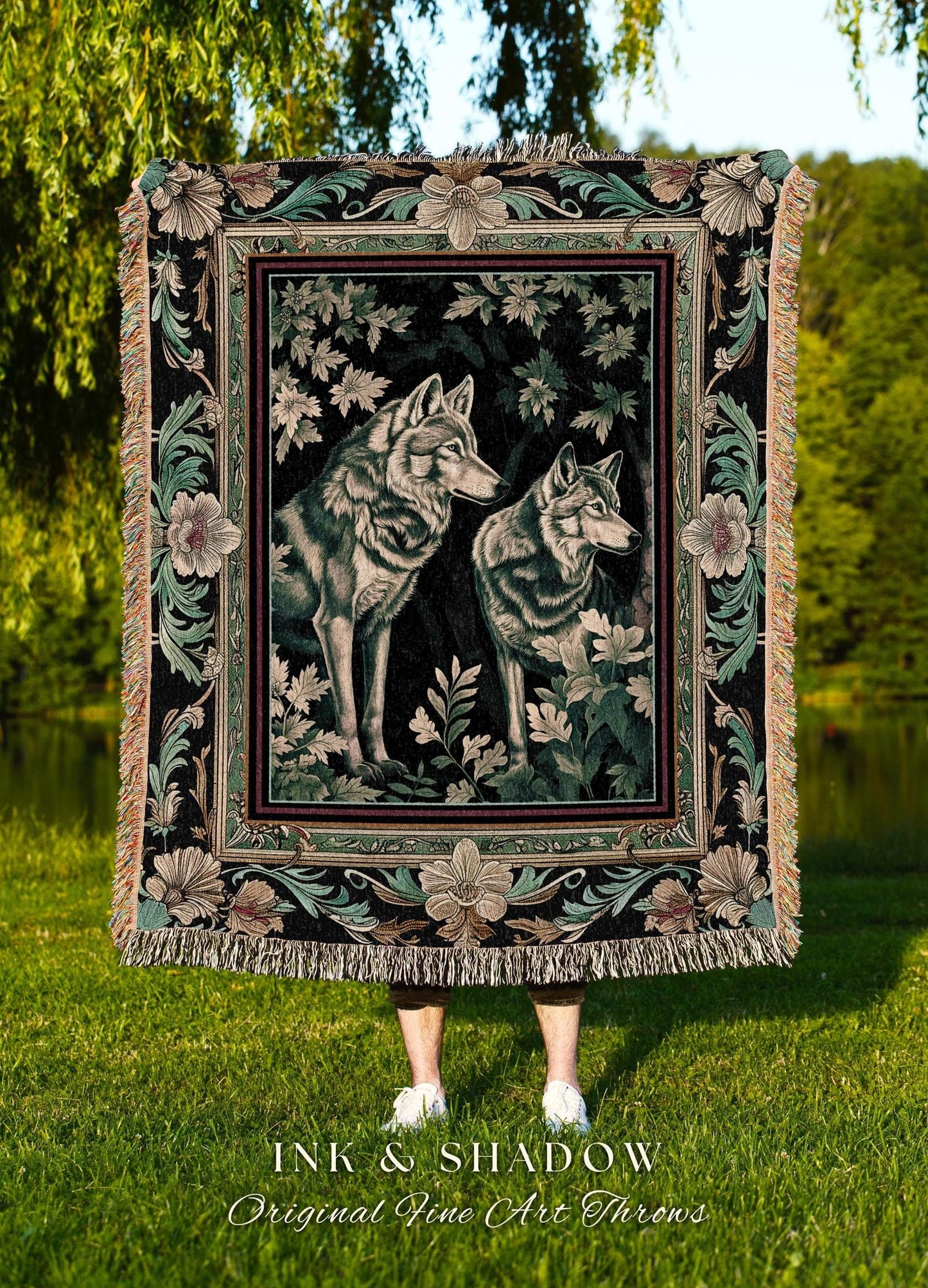 Cozy Cabincore Wolves Blanket | Hygge Bed Throw Scandinavian Woodland Gothic Woven Cotton Tapestry Maximalist Floral Medieval Folklore Style