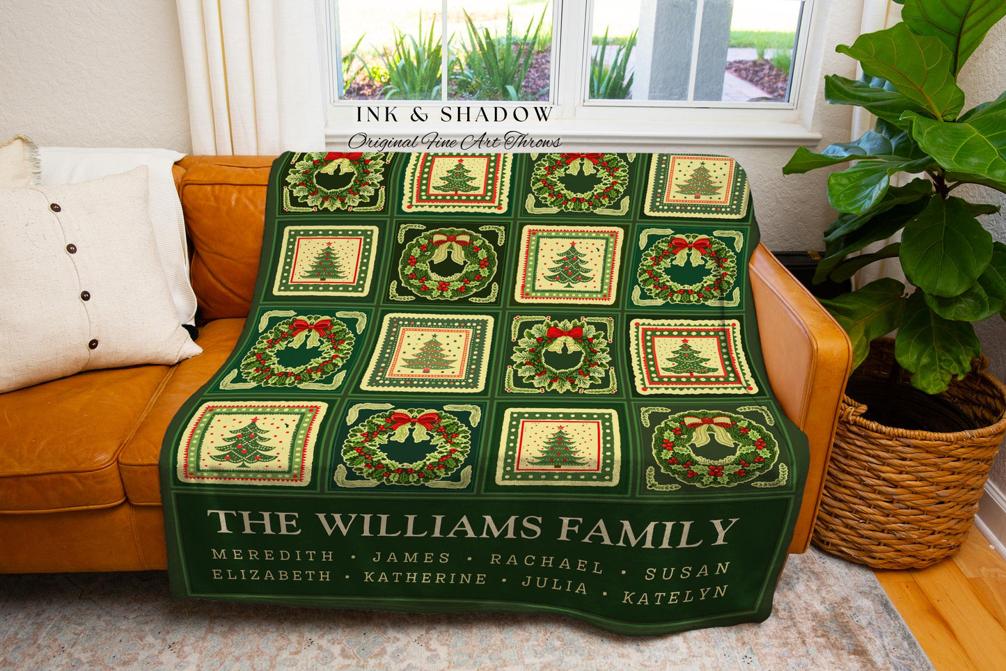 Custom Retro Holiday Throw Personalized Christmas Wreath & Tree Tapestry Blanket with Family Names Festive Meaningful Gift for Grandparents