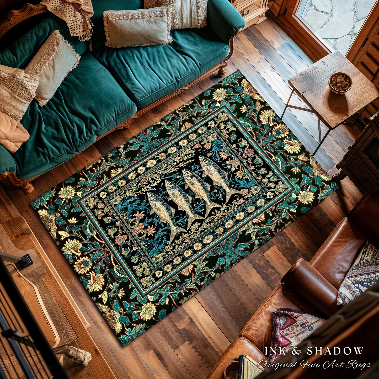 Dark Academia Fish Area Rug | Coastal Enchanted Marine Sardine Art Decor Vintage Nautical Whimsigothic Beach Cottagecore Rustic Home Accent