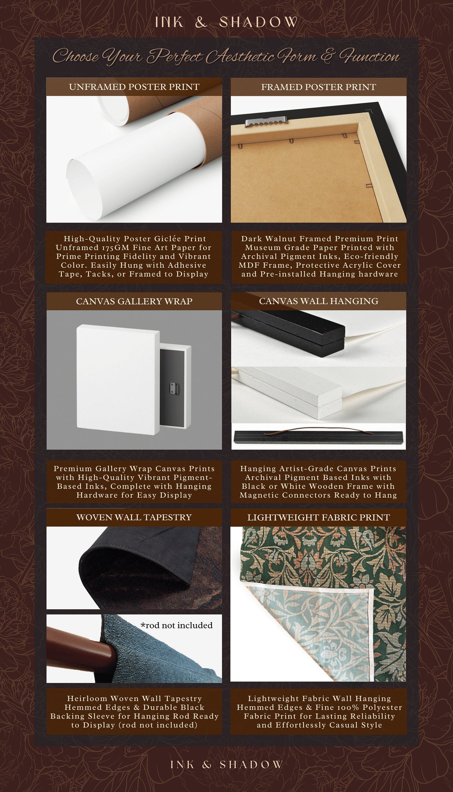 Specializing in distinctive original art pieces that embrace the timeless elegance of the unconventional, Ink & Shadow is a haven for art lovers with an appreciation for the ethereal. We understand that every individual seeks to imbue their living spaces with their own distinct preferences and desires. That's why we offer a diverse range of options, ensuring you can customize your purchases to perfectly suit your unique taste and style.