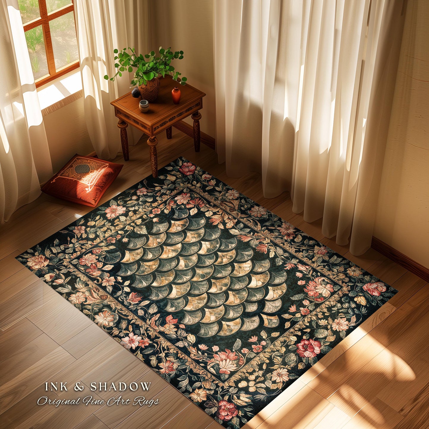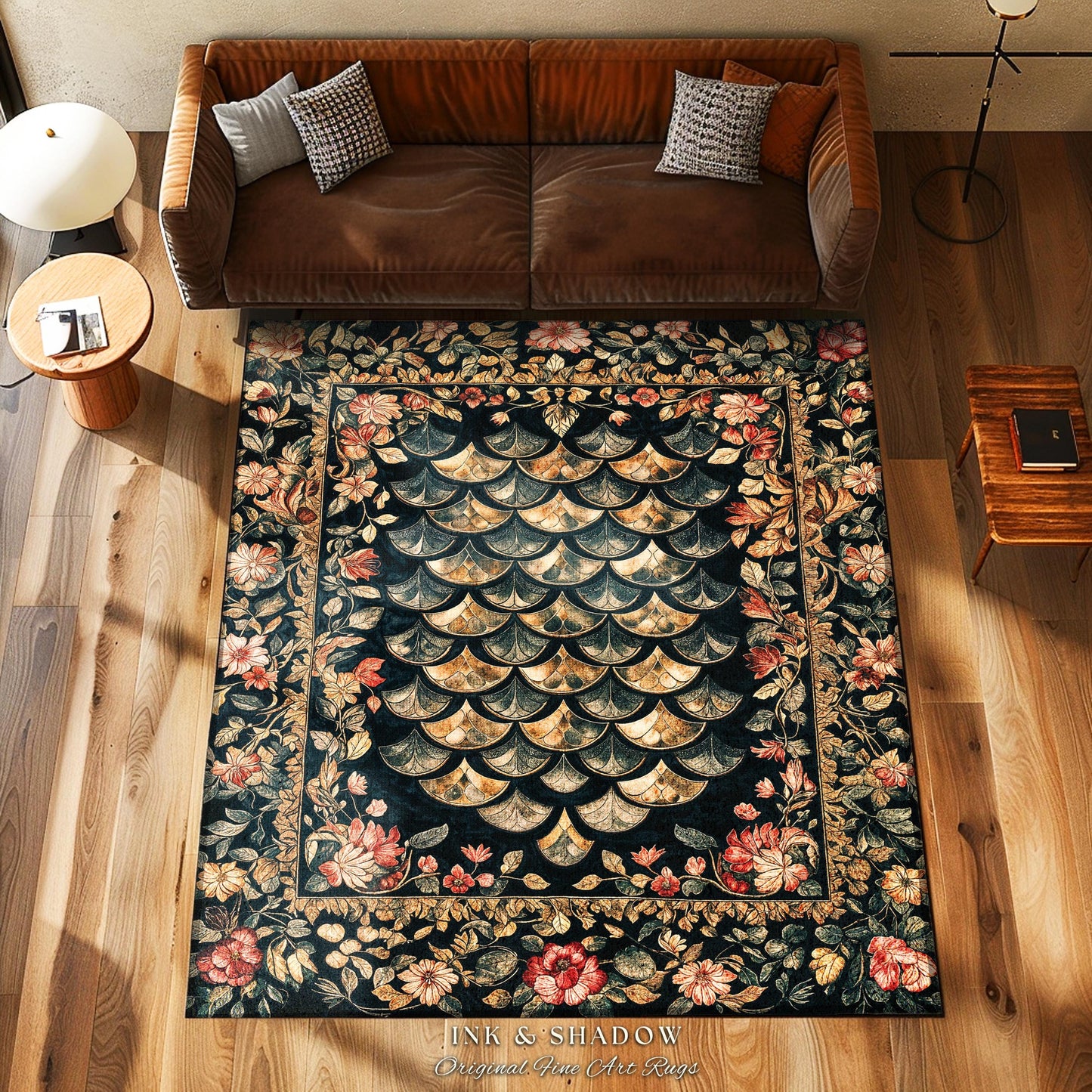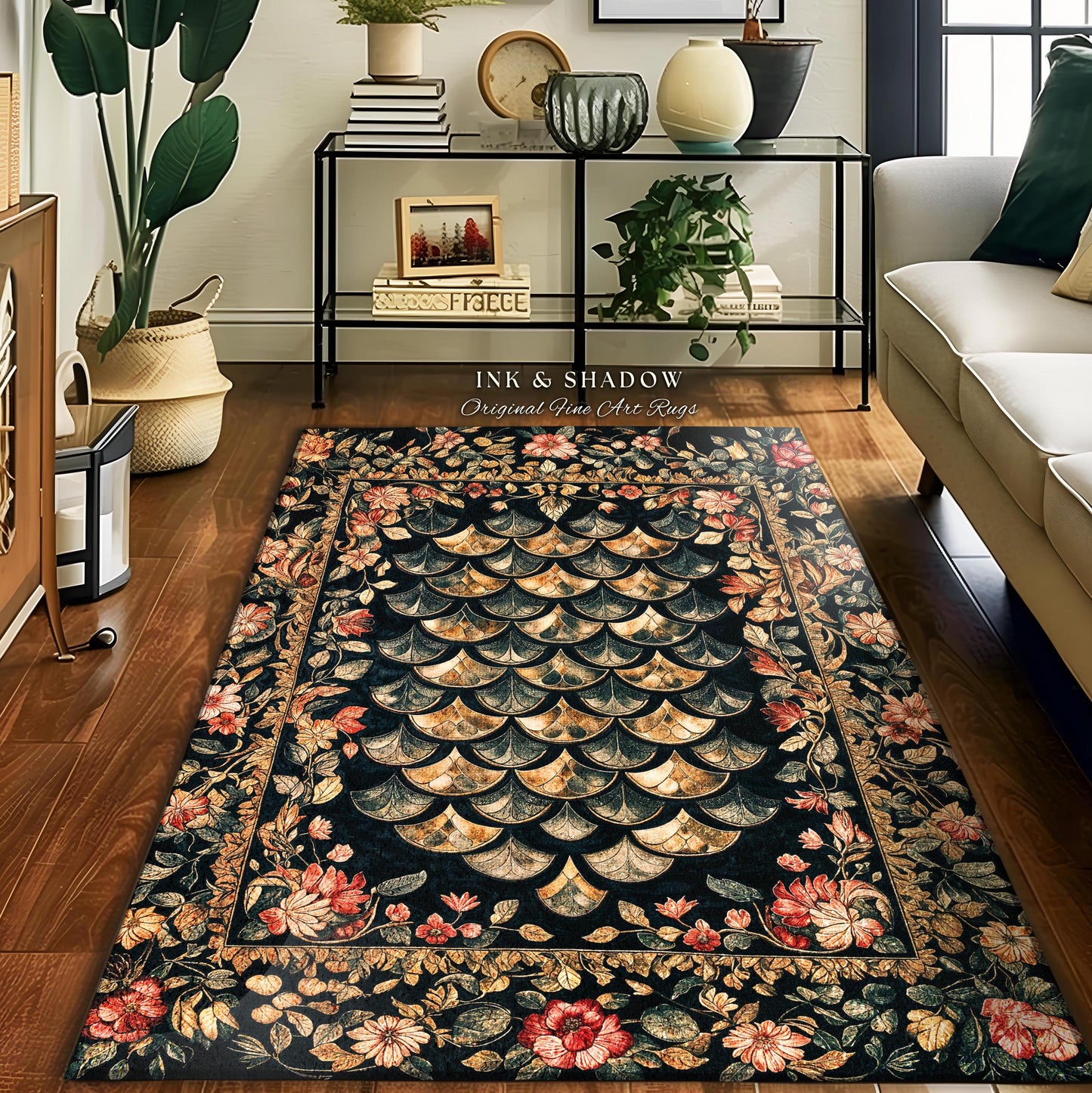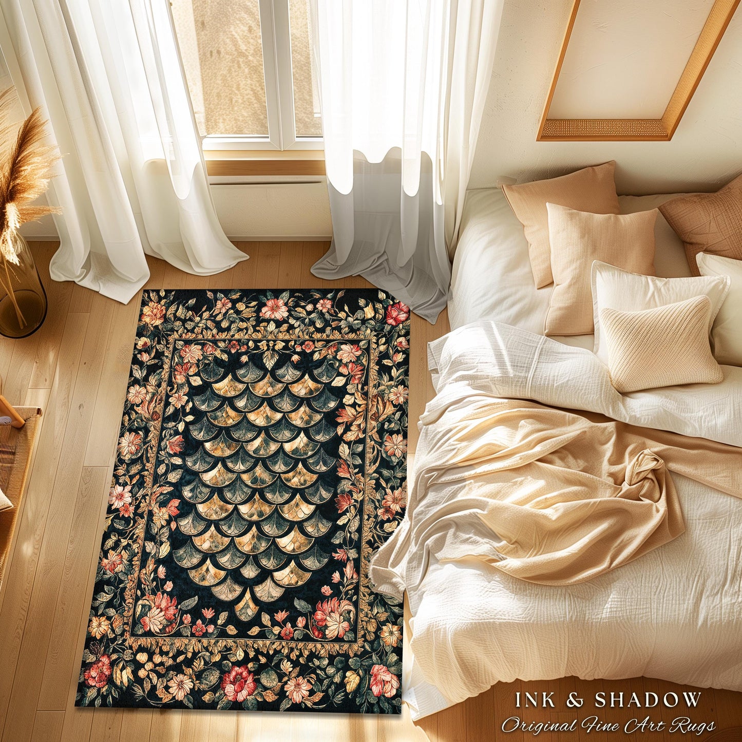 Dark Floral Nordic Inspired Accent Rug | Pink Botanical Fairytale Area Rug Woodland Ethereal Dragon Scales Medieval Aesthetic Fairycore |
