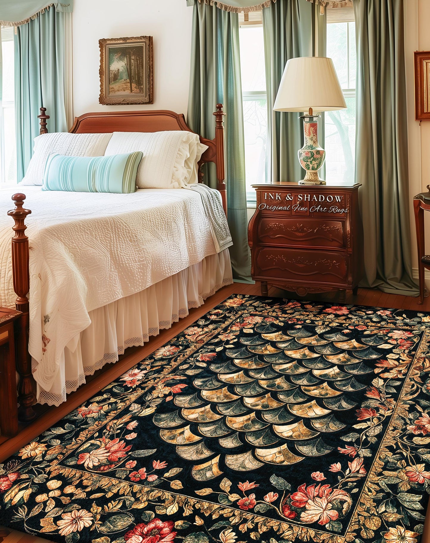 At Ink & Shadow, we approach each rug as a canvas, blending classic design traditions with the captivating charm of the unconventional. Drawing inspiration from 🕯️ Victorian Gothic influences, 🌿 Vintage Botanical Motifs, and 🦋 Woodland Whimsy, our collection aims to capture the beauty of nature’s wilds and the elegance of timeless aesthetics. From our best-selling medieval dragon rugs 🐉 to our captivating floral folk art patterns 🌸 and mystical forest creatures 🦄, we offer a wide selection of one-of-a-kind pieces. Whether you’re seeking something subtle to tie a room together or a bold statement piece to define your space, our over 400 original rug designs bring artistry home in a range of enchanted aesthetics.