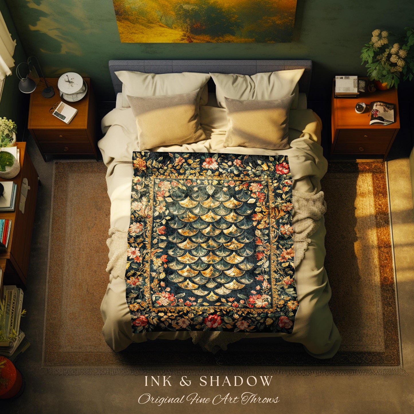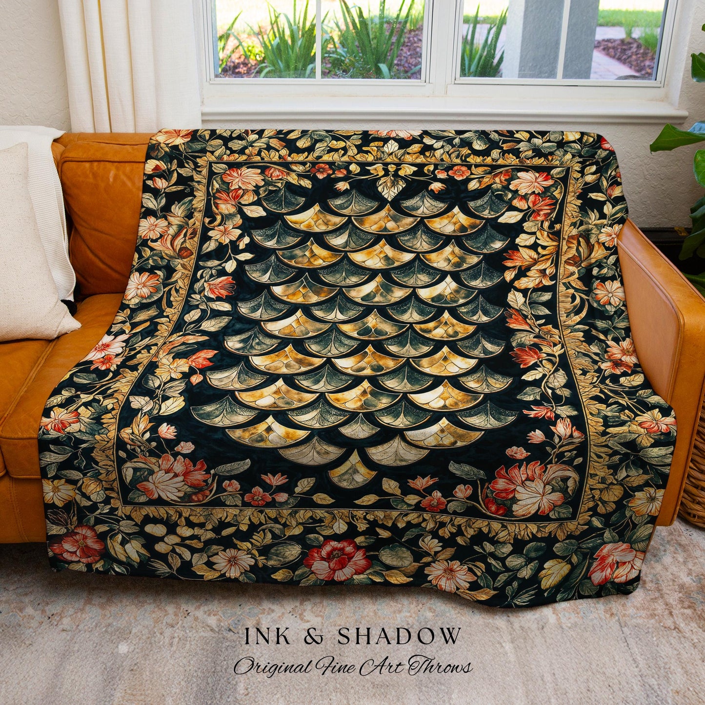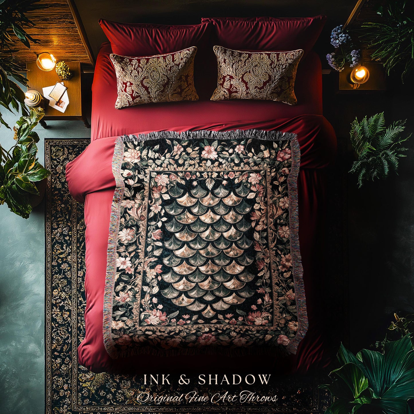 Dark Floral Nordic Inspired Tapestry | Pink Botanical Fairytale Woven Throw Blanket Woodland Ethereal Dragon Scales Medieval Aesthetic Art |