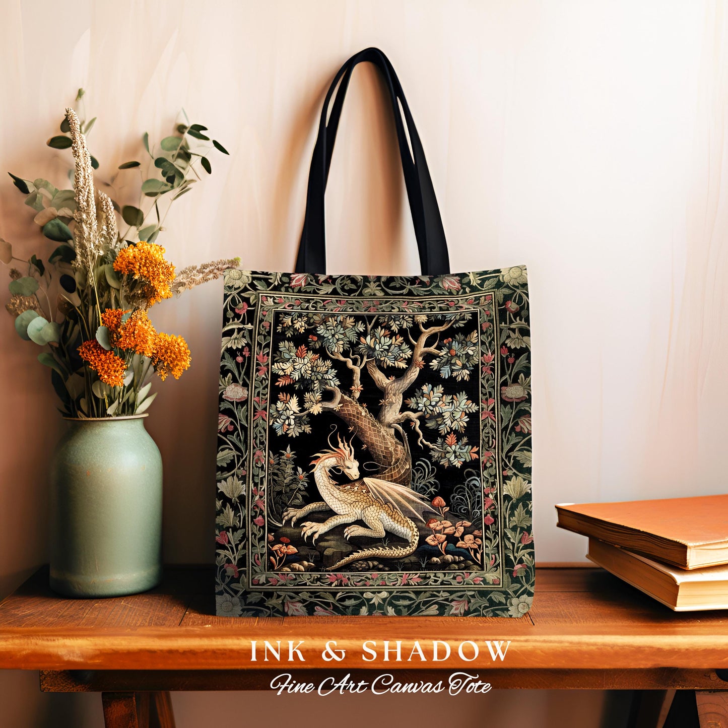 Dragon Tree of Life Woven Tote Medieval Fairytale Accessory, Cottagecore Fairycore Aesthetic Mystical Tapestry Bag Fantasy Inspired Art