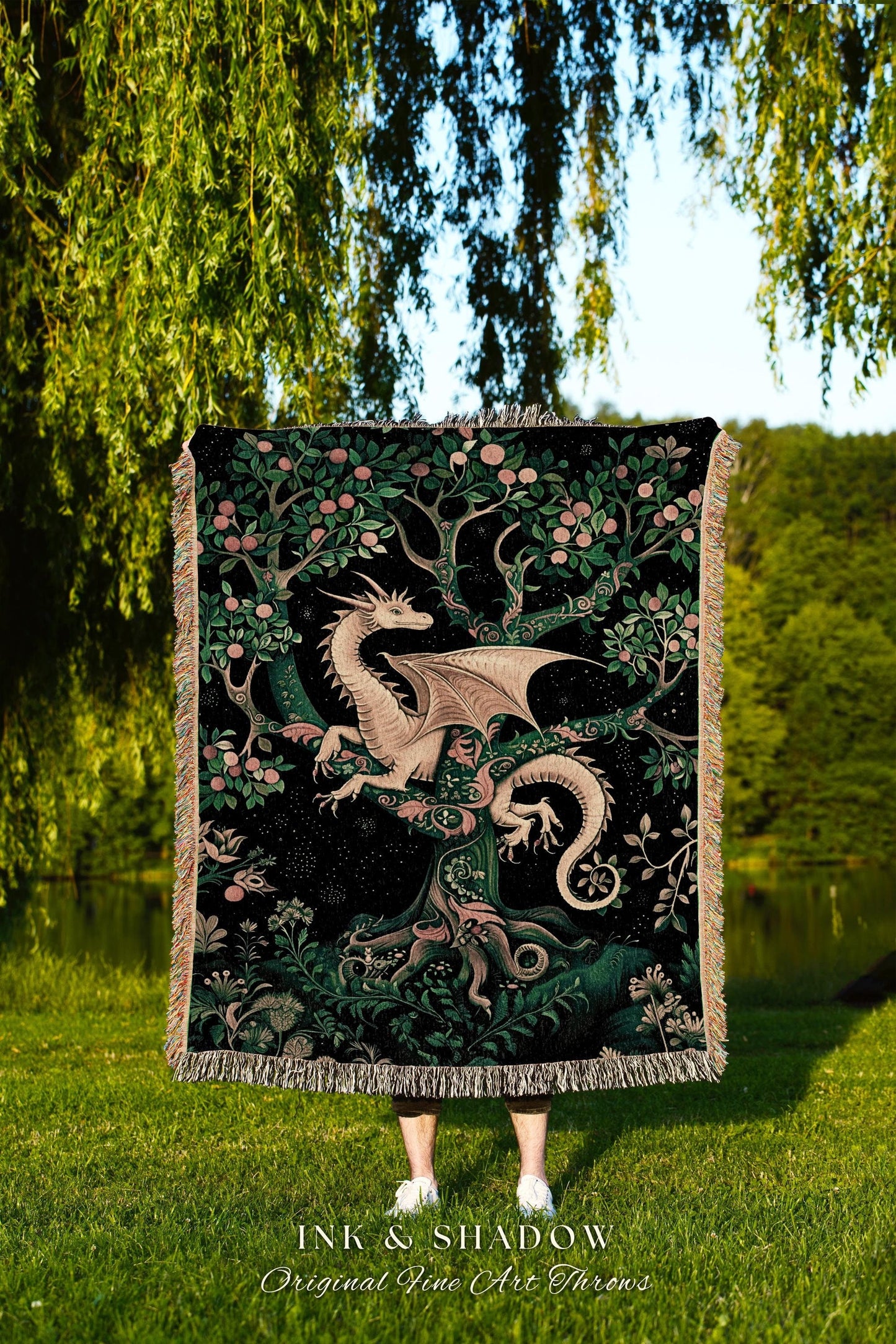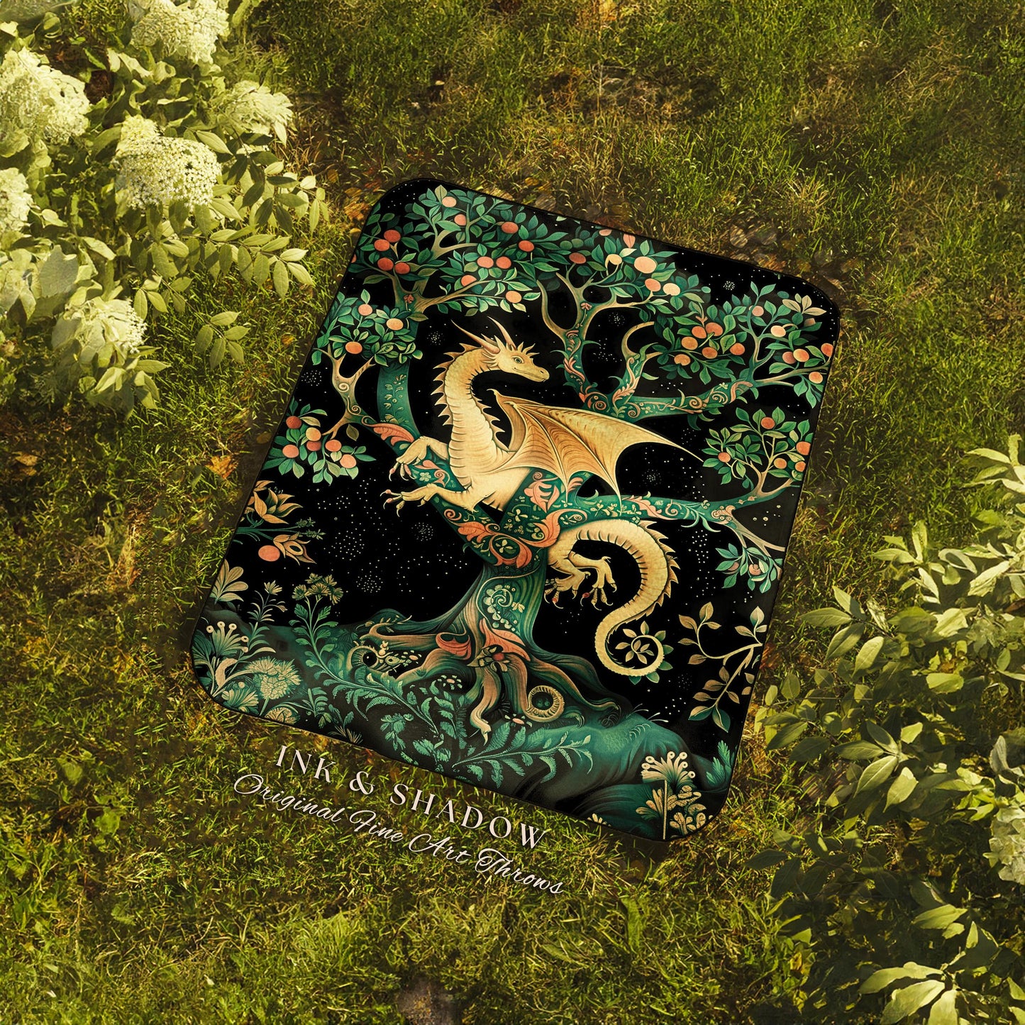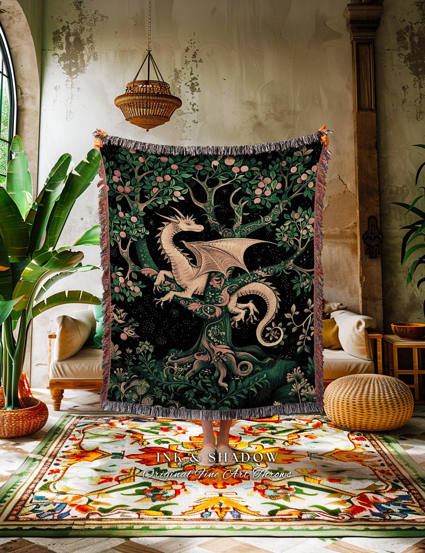 Enchanted Forest Dragon Tapestry Blanket Dark Woodland Gothic Decor | Mystical Cottagecore Aesthetic Vintage Medieval Charm Renaissance Art