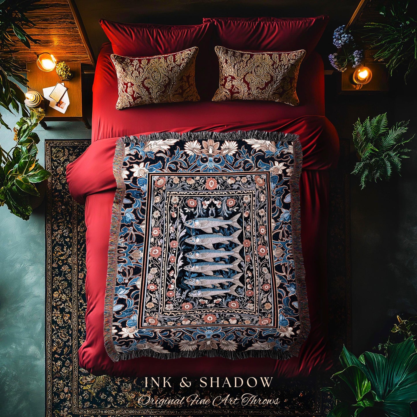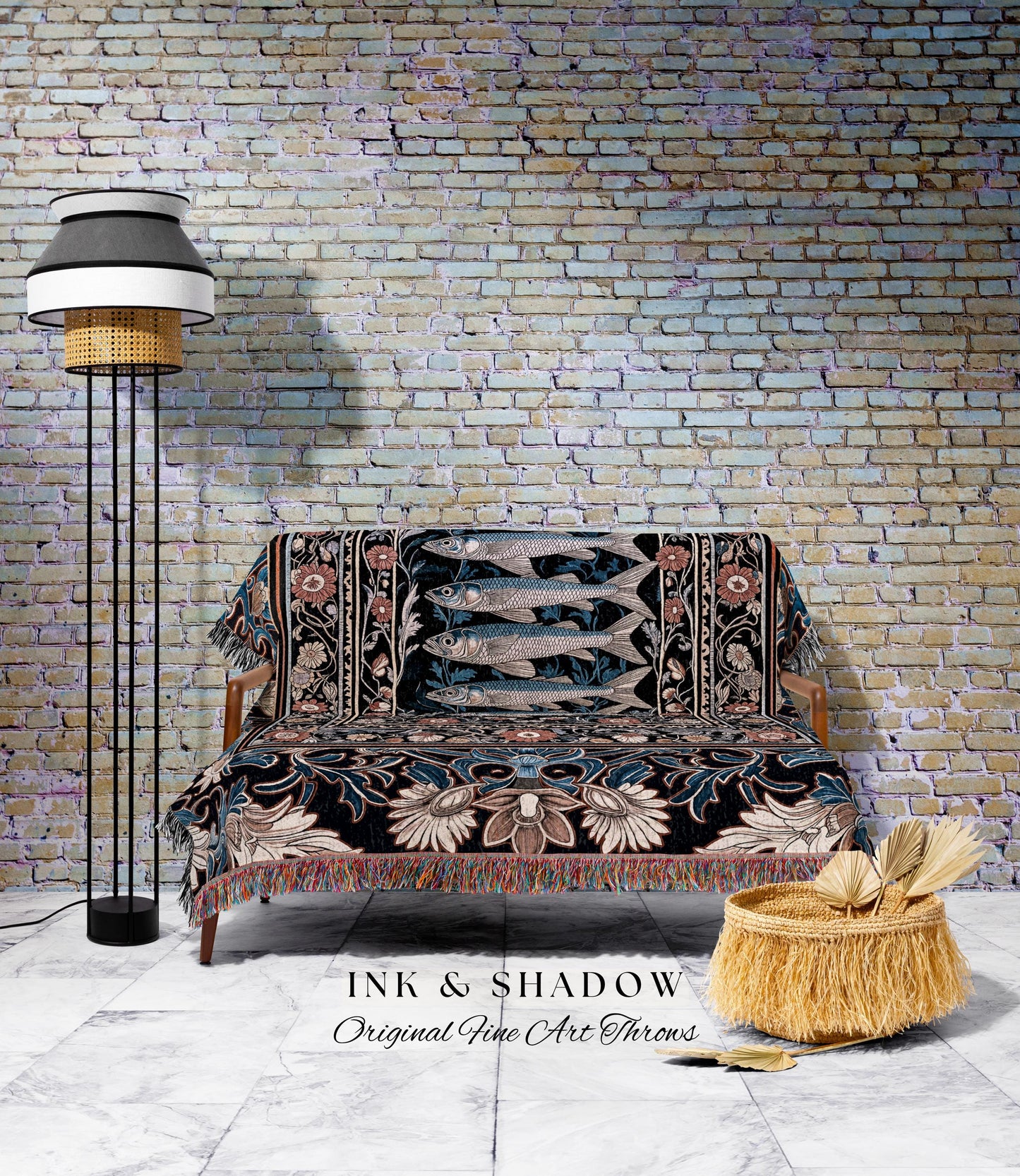 Enchanted Ocean Sardine Fish Blanket Nautical Whimsigothic Coastal Beach Decor | Nordic Marine Underwater Floral Folk Art Sea Life Tapestry
