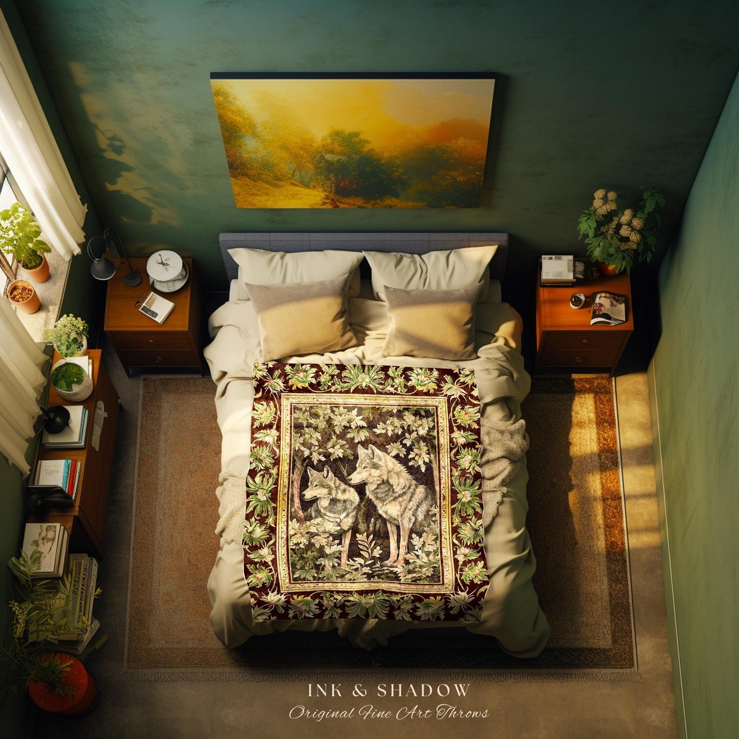 Ethereal Forest Wolves Art Blanket Enchanted Folklore Forestcore Tapestry Blanket, Whimsical Woodland Gothic Ornate Baroque Whimsy Fairycore