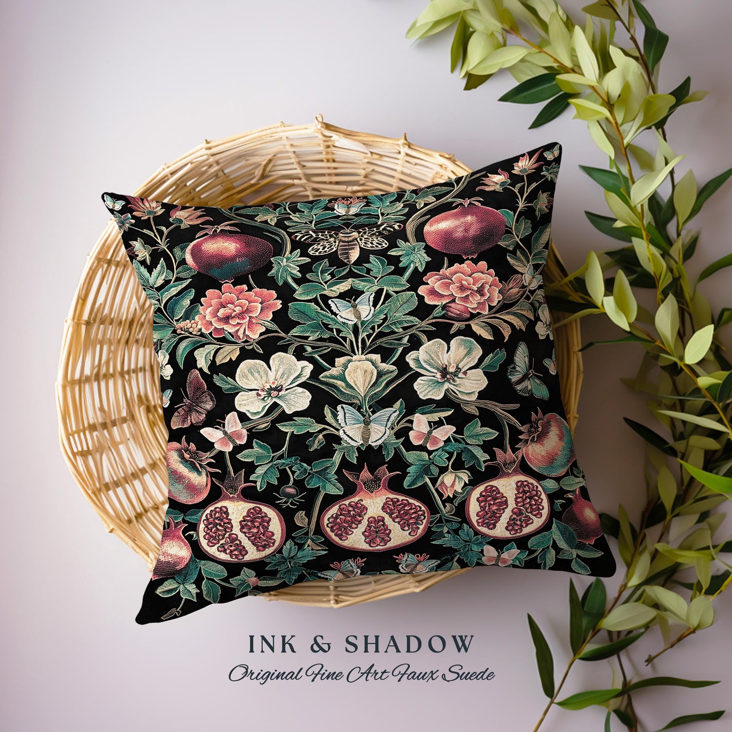 Ethereal Pomegranate Pillow Enchanted Tapestry Botanical Cushion | Baroque Inspired Dark Academia Butterfly Moth Gothic Floral Fruit Decor