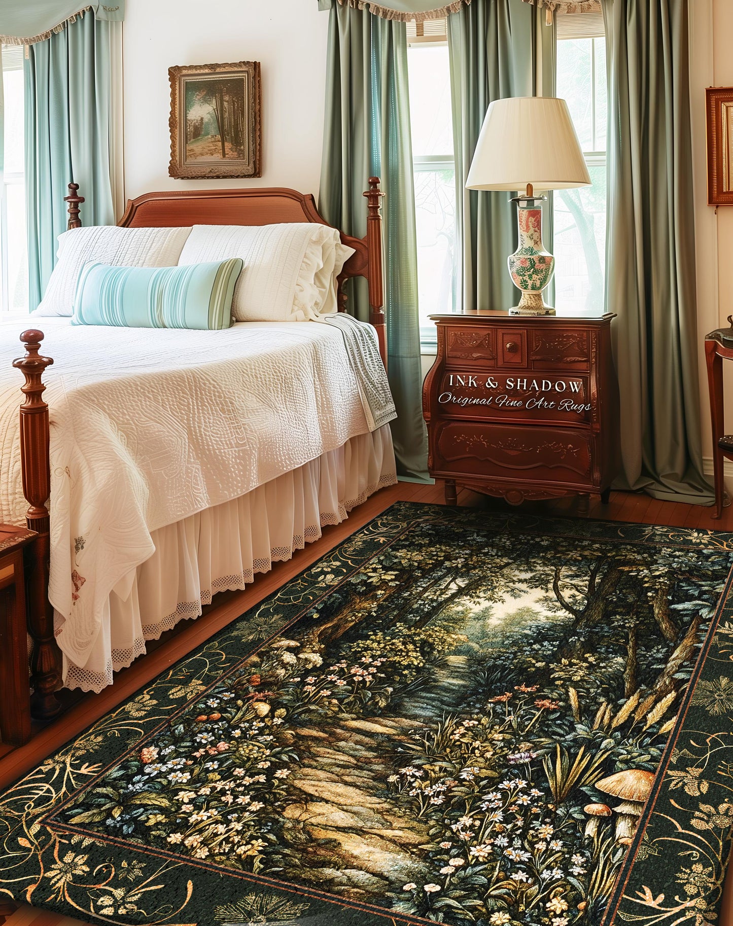 At Ink & Shadow, we approach each rug as a canvas, blending classic design traditions with the captivating charm of the unconventional. Drawing inspiration from 🕯️ Victorian Gothic influences, 🌿 Vintage Botanical Motifs, and 🦋 Woodland Whimsy, our collection aims to capture the beauty of nature’s wilds and the elegance of timeless aesthetics. From our best-selling medieval dragon rugs 🐉 to our captivating floral folk art patterns 🌸 and mystical forest creatures 🦄, we offer a wide selection of one-of-a-kind pieces. Whether you’re seeking something subtle to tie a room together or a bold statement piece to define your space, our over 400 original rug designs bring artistry home in a range of enchanted aesthetics.