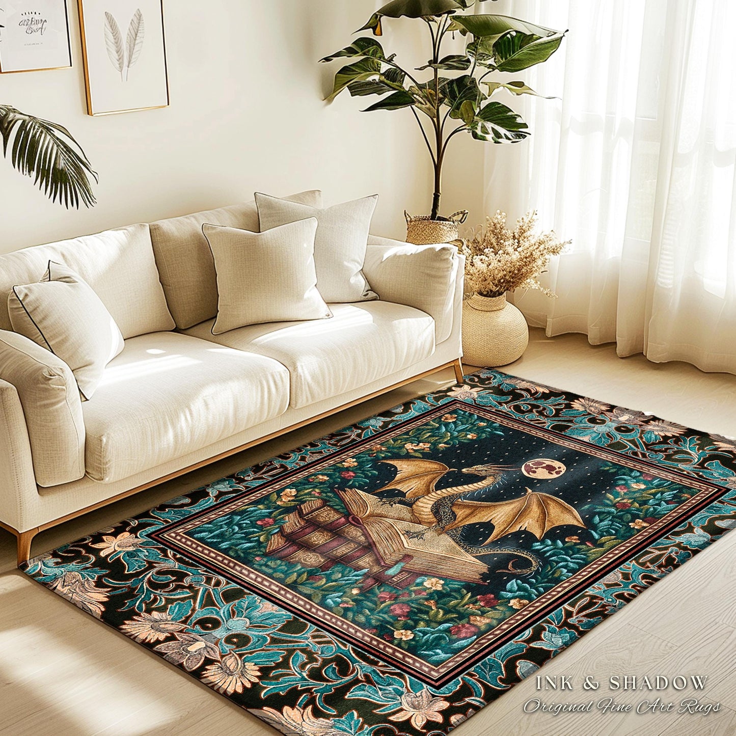 At Ink & Shadow, we approach each rug as a canvas, blending classic design traditions with the captivating charm of the unconventional. Drawing inspiration from 🕯️ Victorian Gothic influences, 🌿 Vintage Botanical Motifs, and 🦋 Woodland Whimsy, our collection aims to capture the beauty of nature’s wilds and the elegance of timeless aesthetics. From our best-selling medieval dragon rugs 🐉 to our captivating floral folk art patterns 🌸 and mystical forest creatures 🦄, we offer a wide selection of one-of-a-kind pieces. Whether you’re seeking something subtle to tie a room together or a bold statement piece to define your space, our over 400 original rug designs bring artistry home in a range of enchanted aesthetics.
