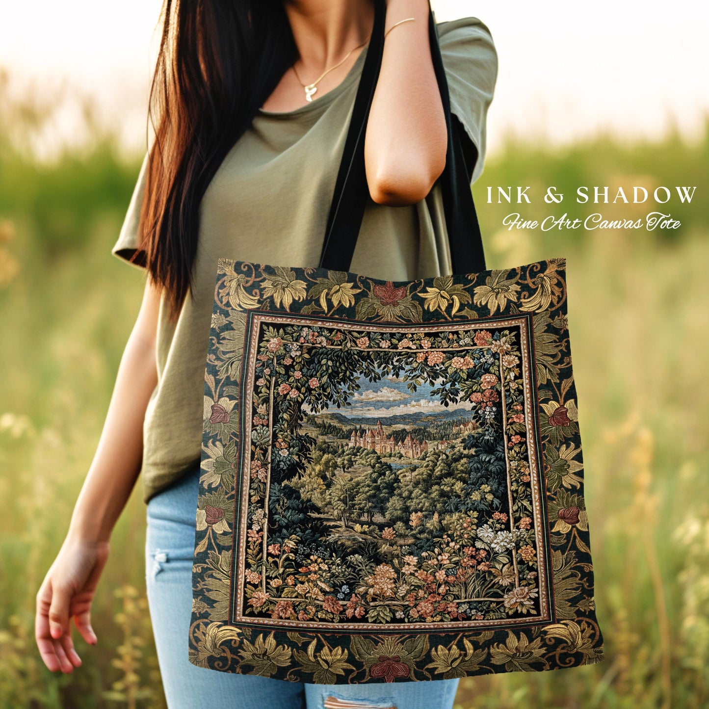 Fantasy Castle Botanical Woven Tapestry Tote | Fairycore Princess Bag Woodland Moody Medieval Woodland Fairytale Whimsy Whimsigothic Decor |