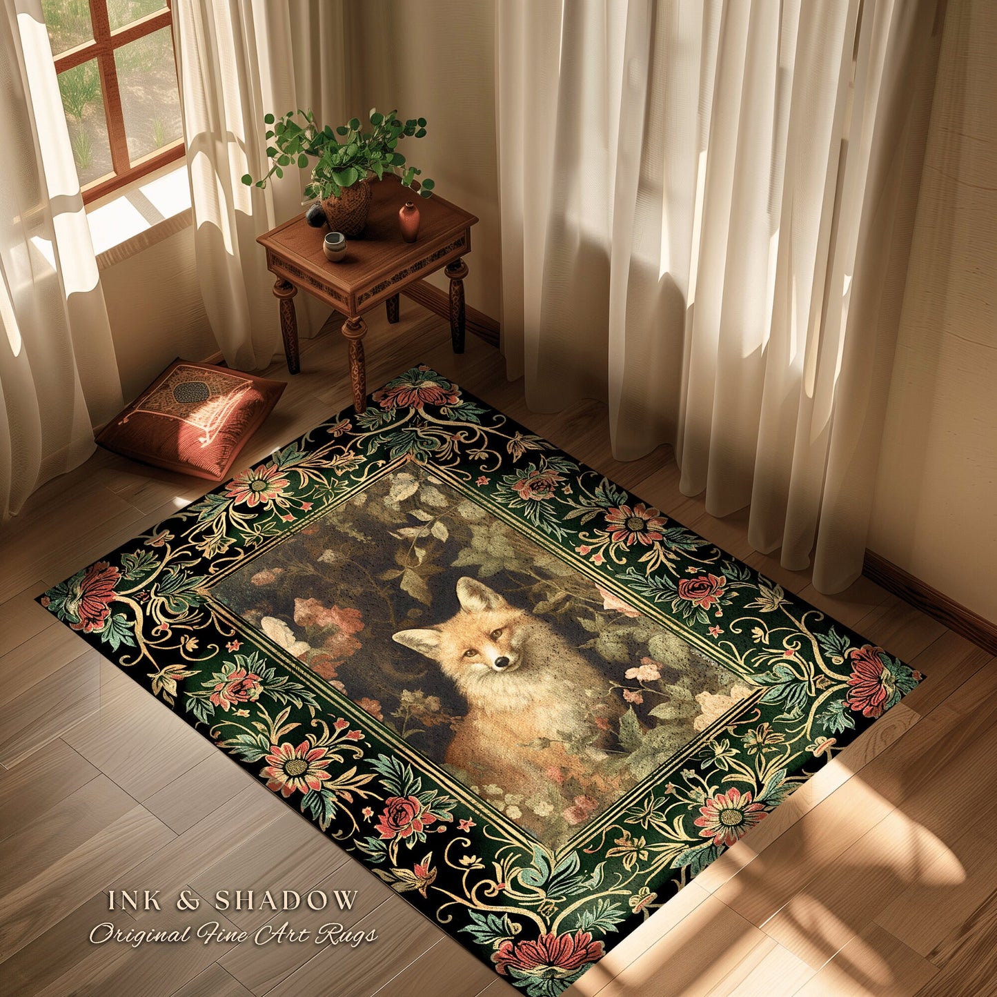 Floral Fairycore Whimsigoth Round Fox Botanical Rug Dark Forestcore Decor | Boho Botanical Whimsical Fox Woodland Cottagecore Animal Art Rug