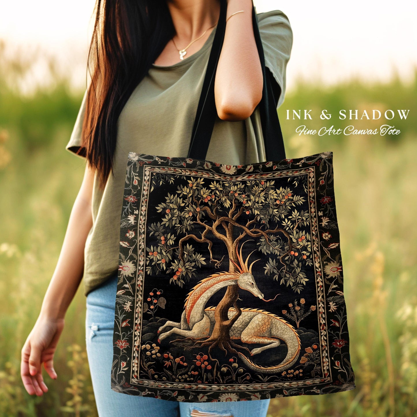Folklore Dragon Tote Mystical Medieval Style Cottagecore Accessory, Botanical Fairytale Forest Gothic Woodland Fairycore Woven Tapestry Bag