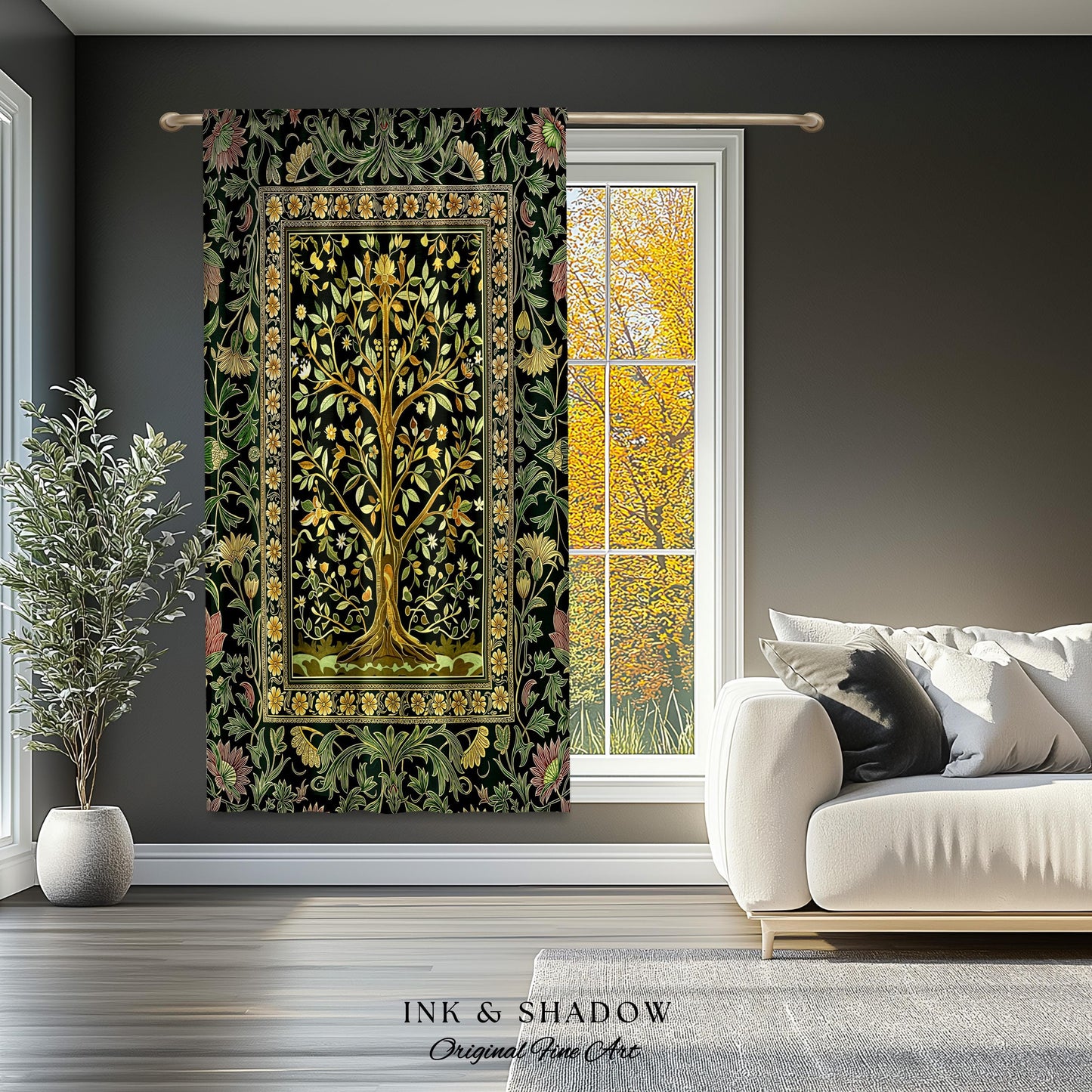 Golden Aesthetic Tree of Life Curtains | Emerald Botanical Decor Romantic Folklore Gothic Tapestry Style Vintage Floral Maximalist Drapes |