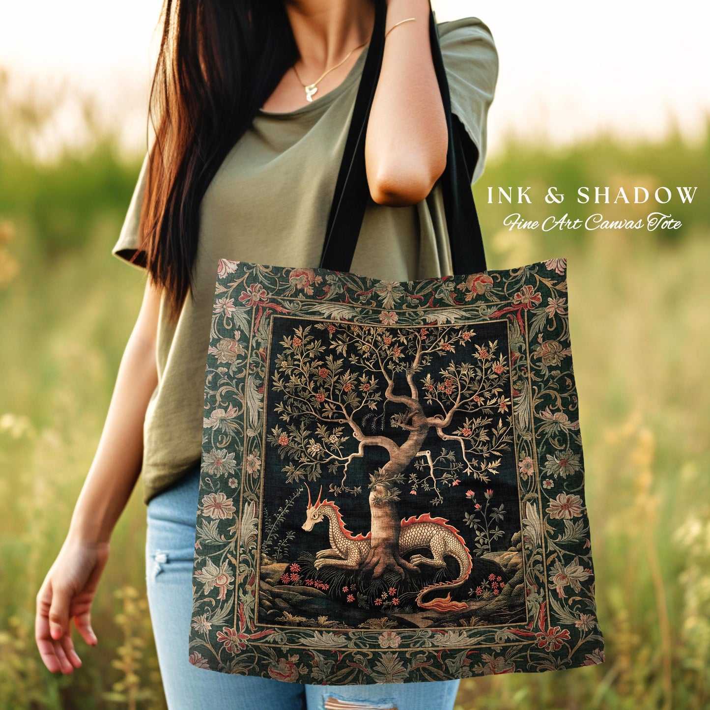 Maximalist Aesthetic Dragon Tote Fairytale Inspired Accessories, Medieval Cottagecore Style Botanical Tapestry Bag Whimsical Fairycore Art