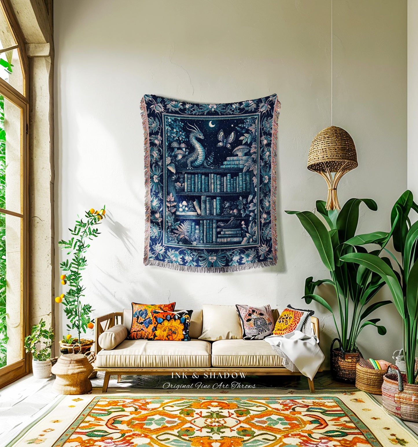 Midnight Blue Enchanted Library Dragon Blanket Celestial Dark Academia Fairycore | Whimsical Gothic Cottagecore Fantasy Art Tapestry Throw
