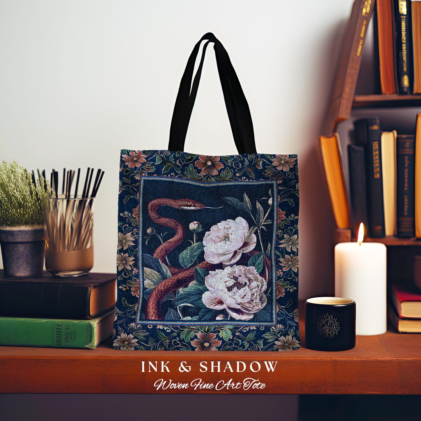 Moody Dark Botanical Serpent Enchanted Floral Tapestry Tote Exotic Gothic Bag | Ethereal Woodland Snake Victorian Art Nouveau Accessories