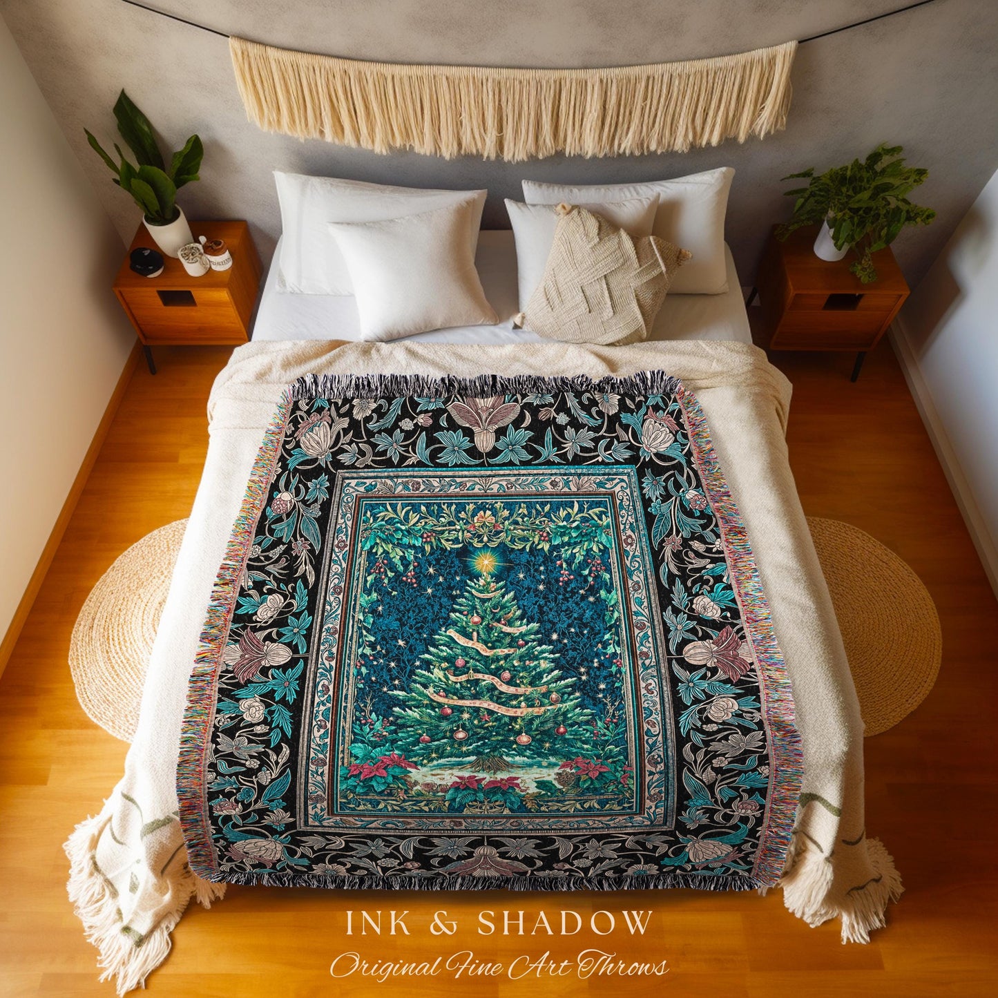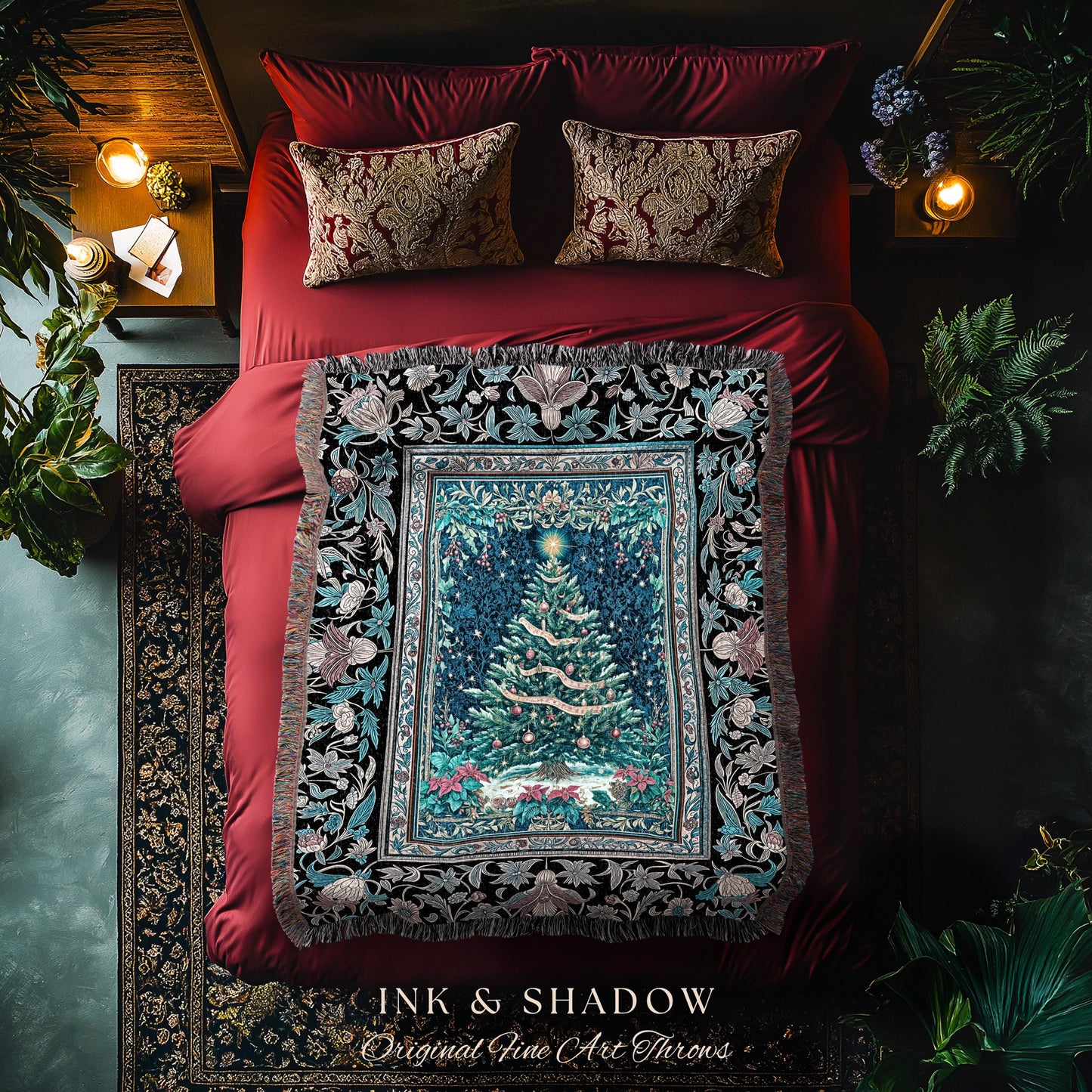 Moody Winter Christmas Tree Blanket | Snowy Aesthetic Holiday Woven Tapestry Cozy Decor Vintage Floral Cottagecore Festive Throw Rustic Gift