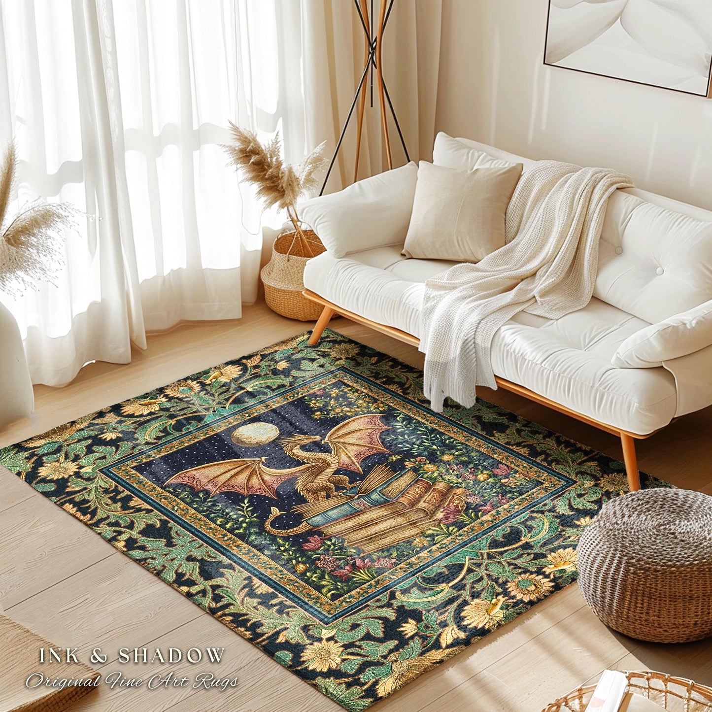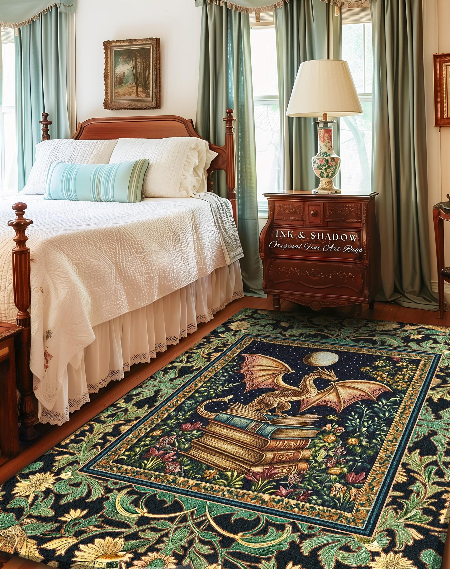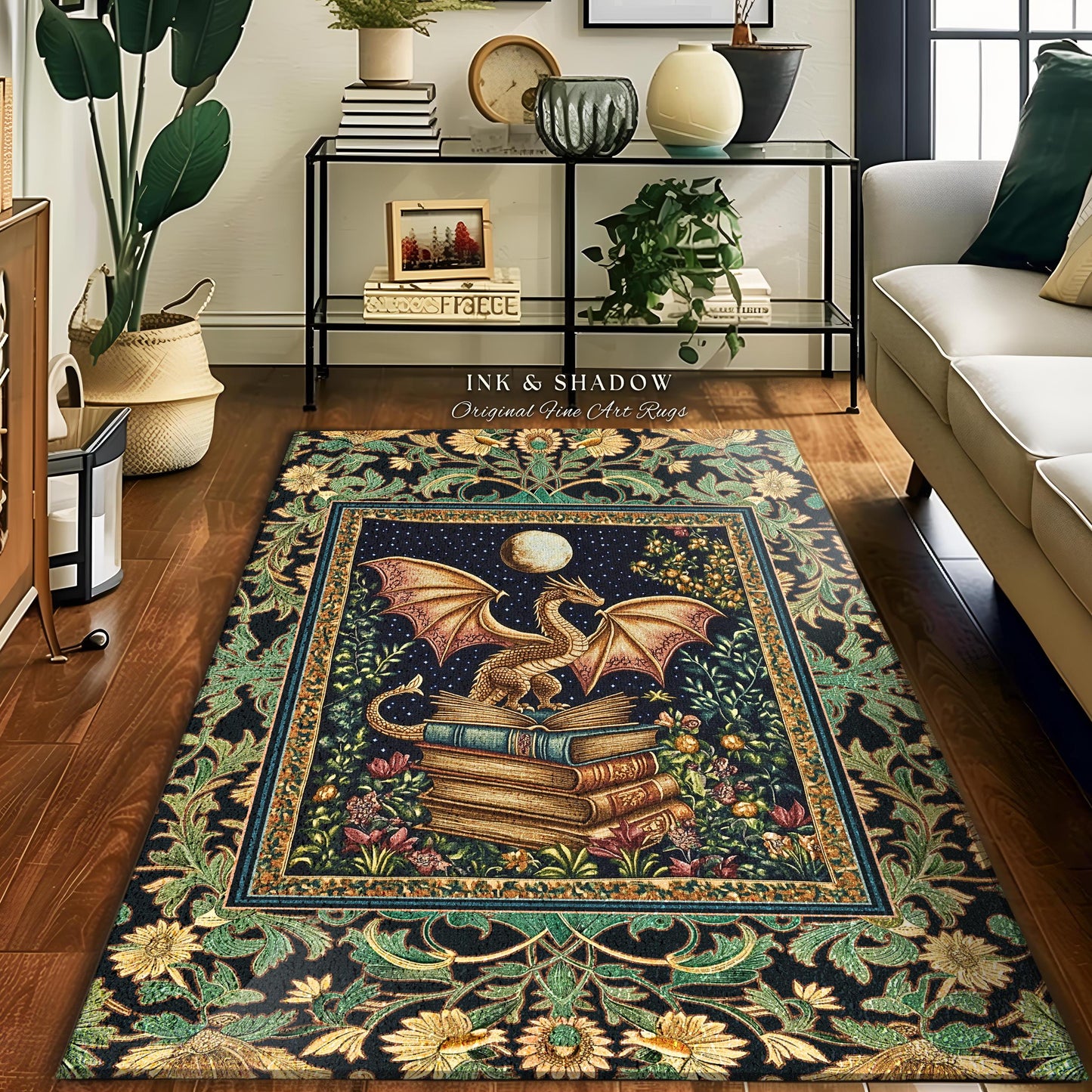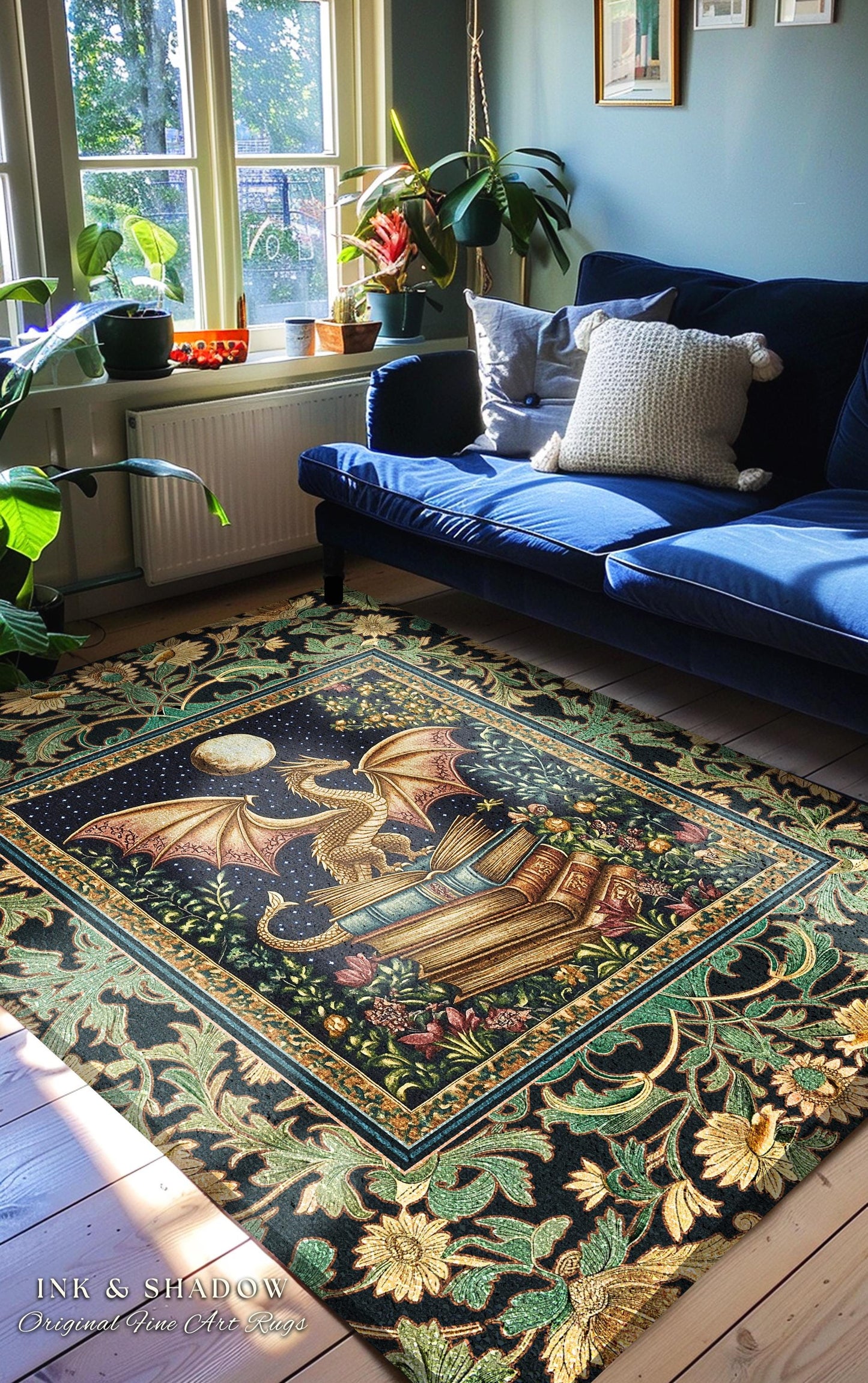 Moonlit Book Dragon Area Rug | Book Nook Victorian Floral Aesthetic Dark Academia Reading Room Storybook Accent Rug Book Lover Home Decor |