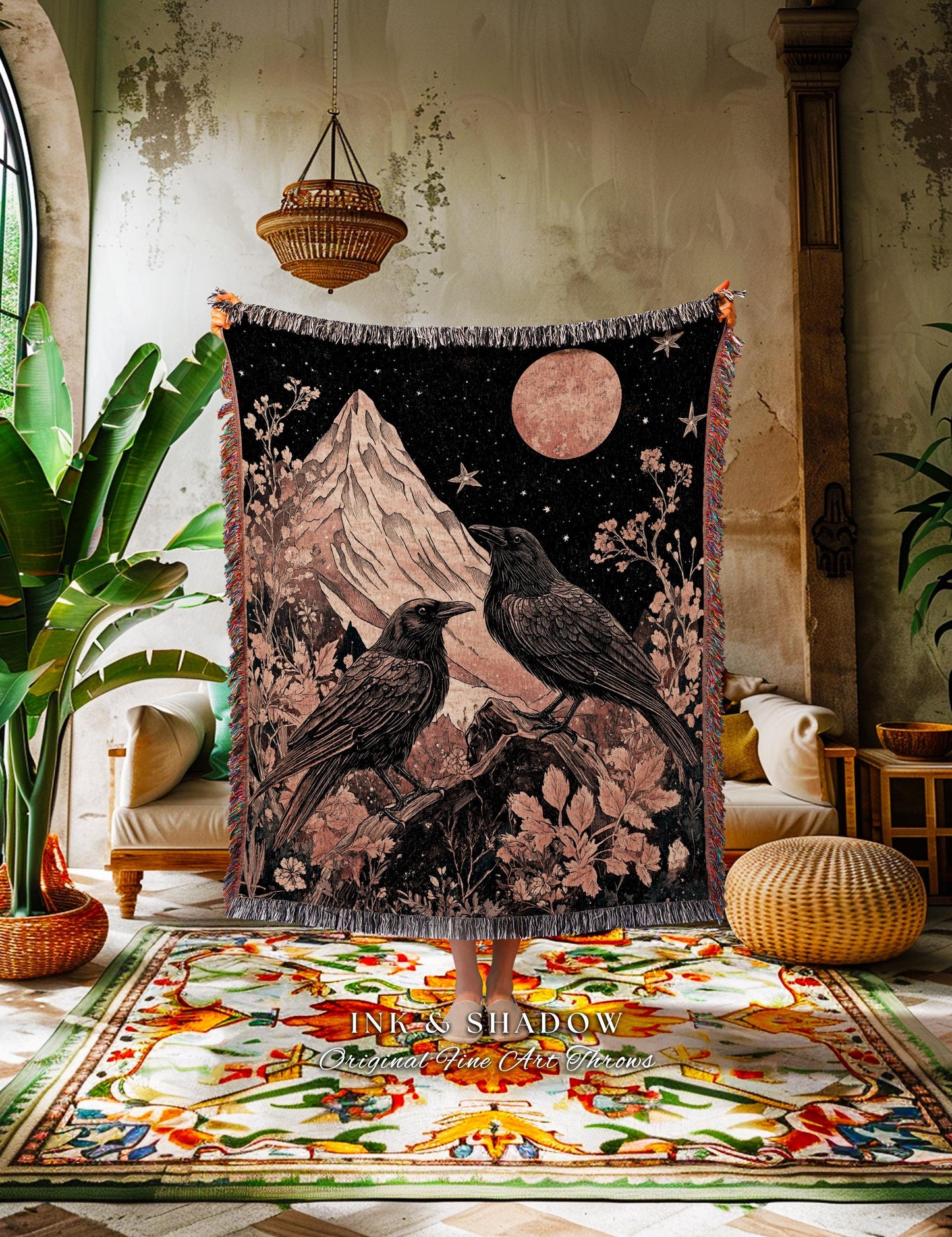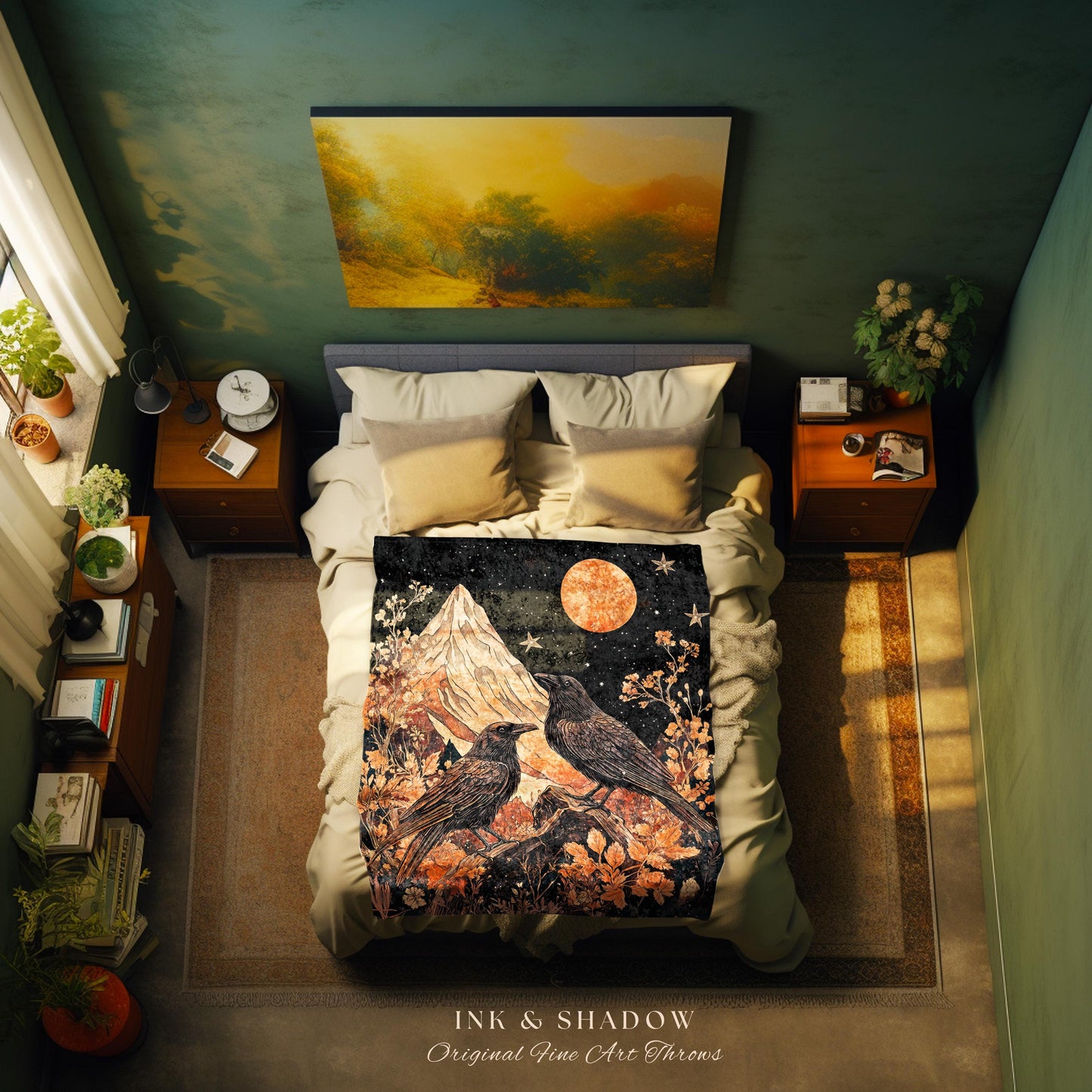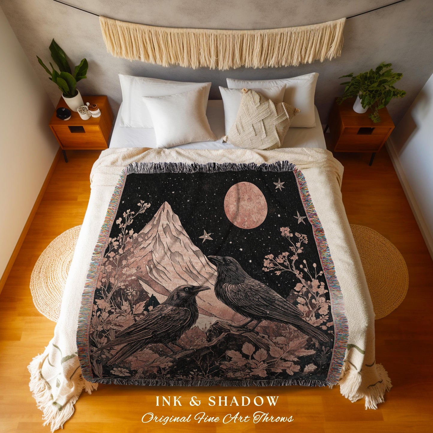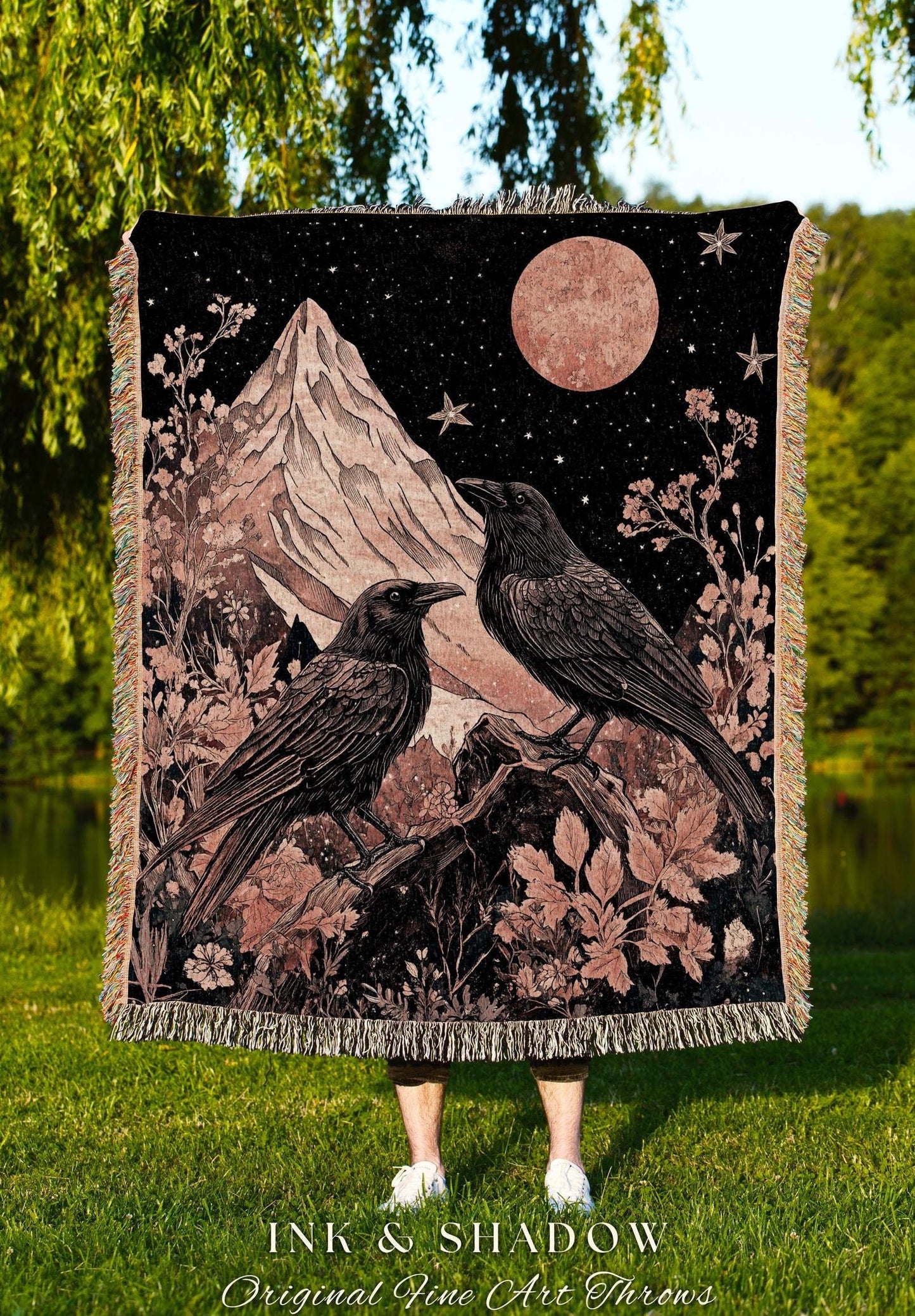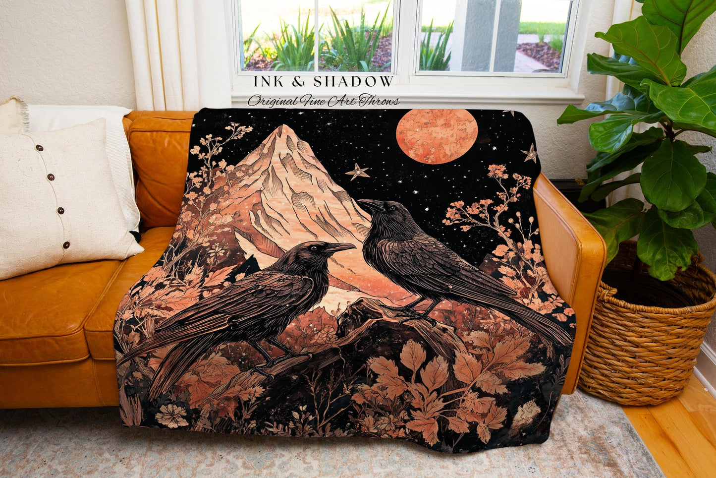 Mountain Moonlit Crow Celestial Gothic Enchantment Blanket , Whimsical Woodland Forestcore Raven Tapestry Vintage Peach Cottagegoth Crowcore