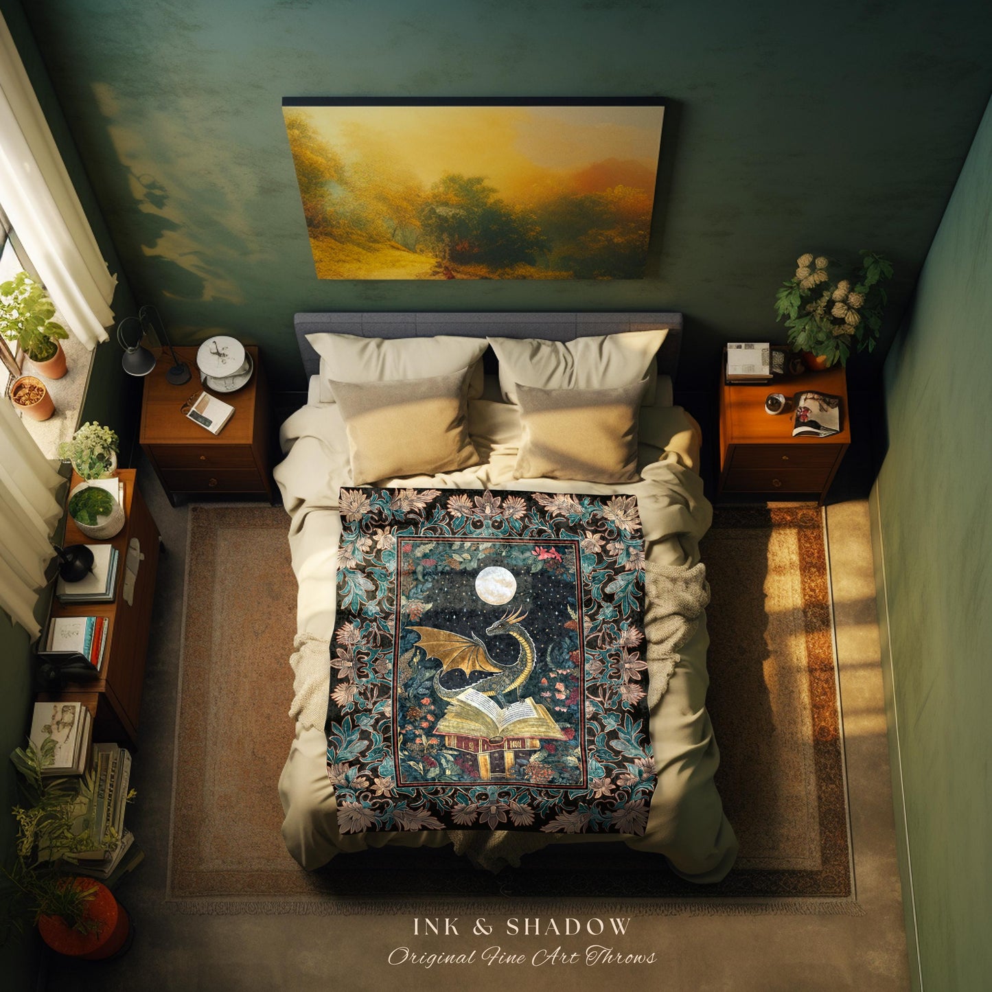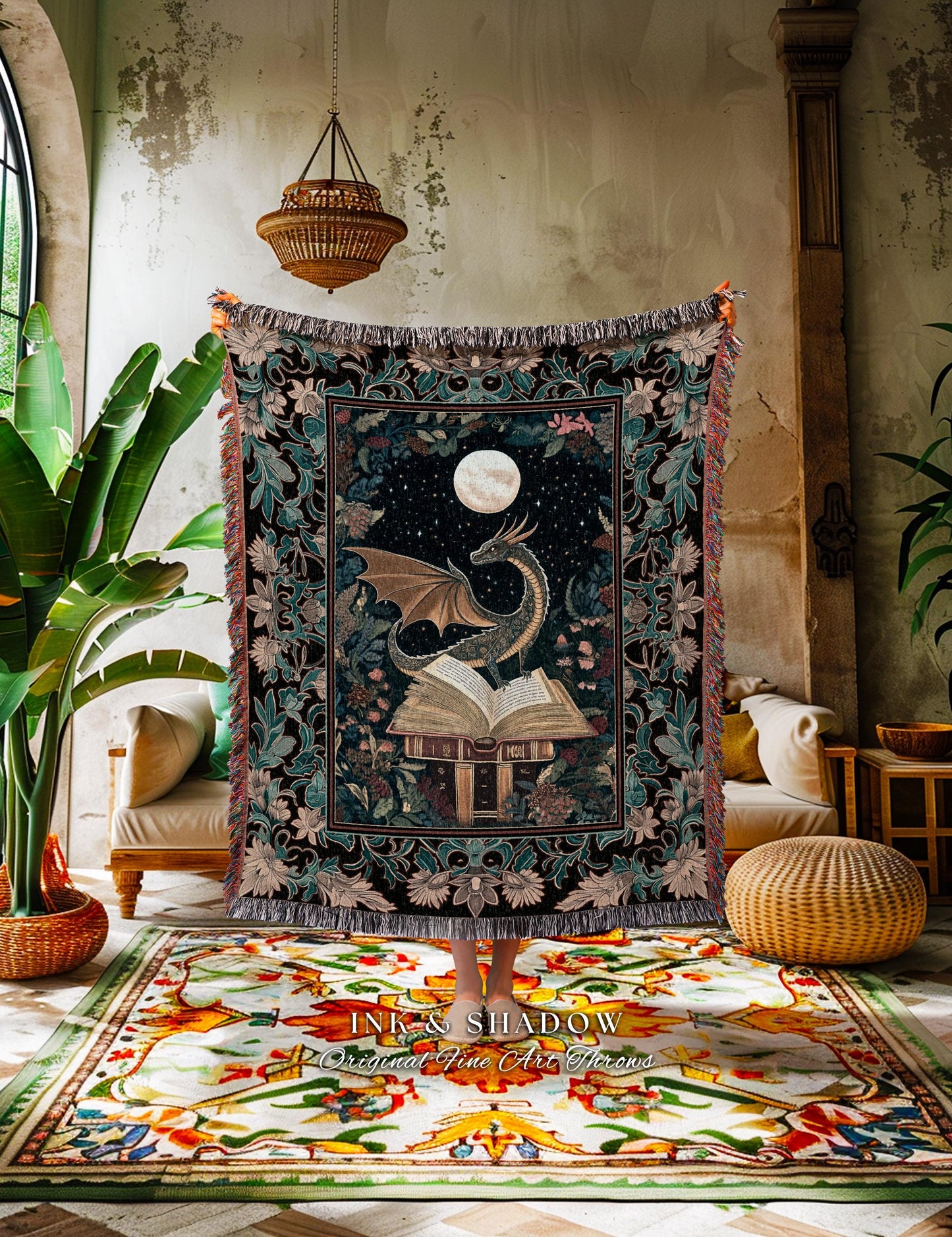 Mystic Academia Dragon Throw Blanket | Moonlit Fantasy Book Nook Tapestry Whimsical Bedroom Fairytale Dark Cottagecore Tapestry Woven Floral