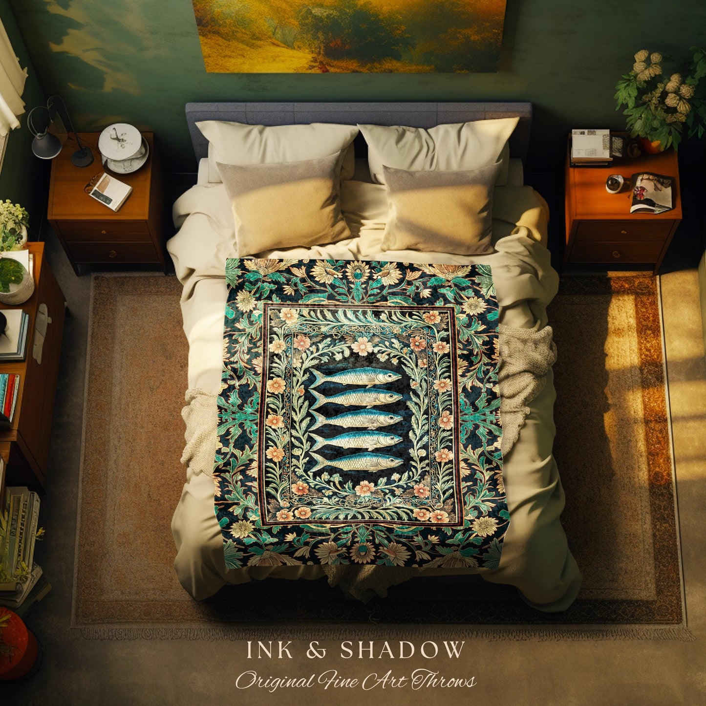 Mystical Floral Underwater Fish Tapestry Antique Sardine Art Ocean Decor, Coastal Beach Home Blanket Rustic Marine Cottagecore Tapestry Art