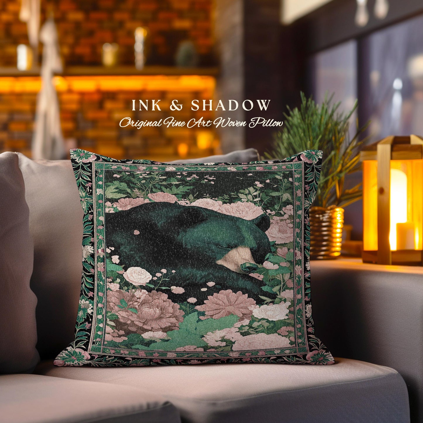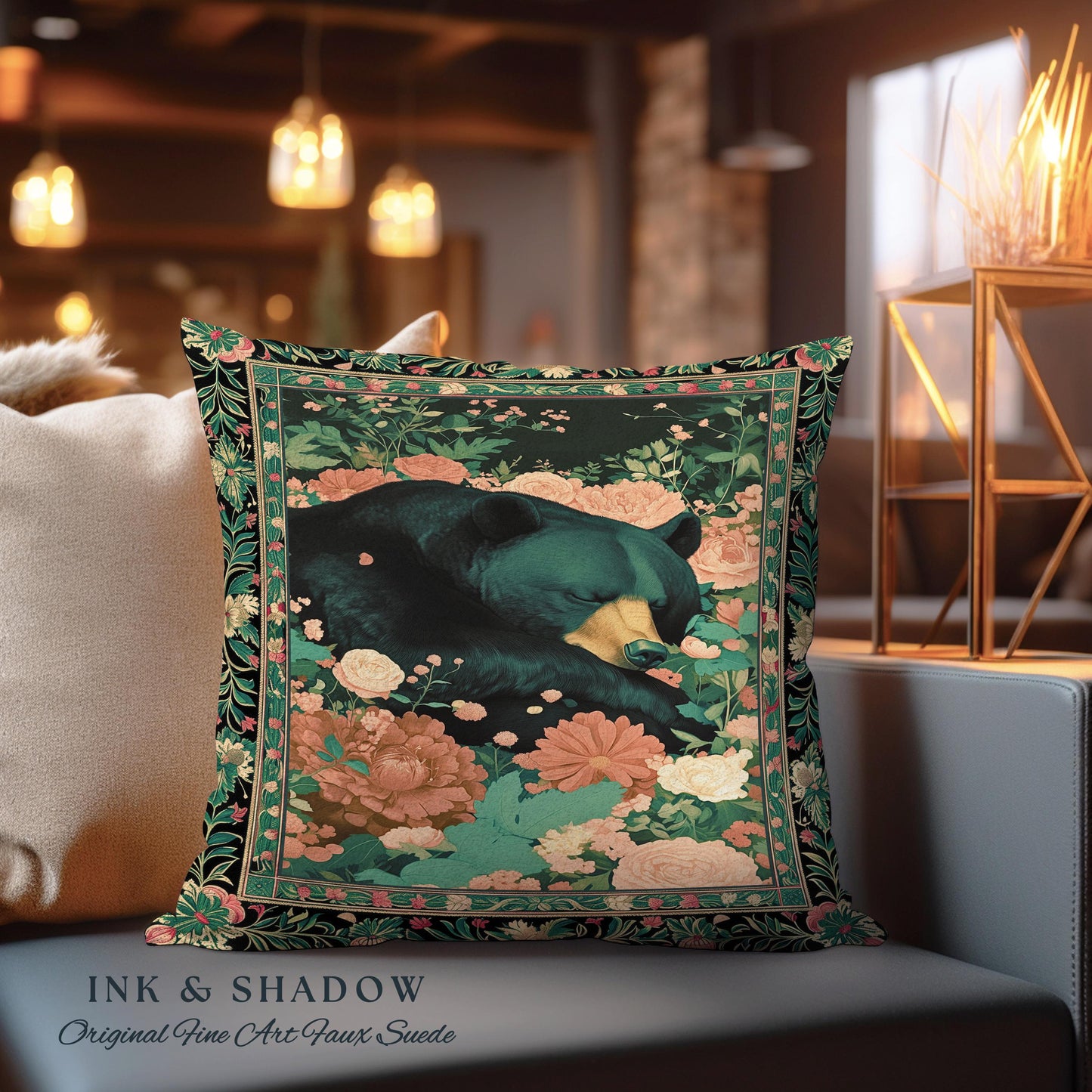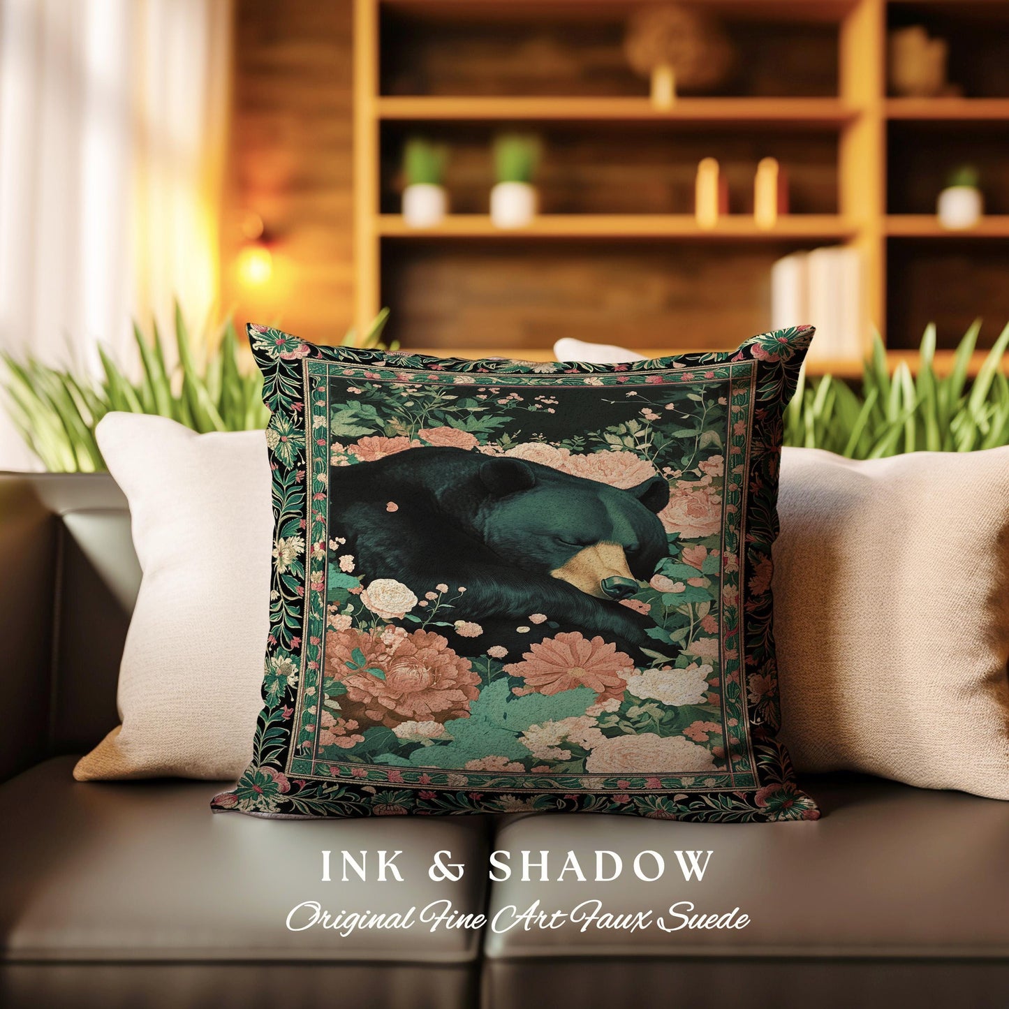 Mystical Sleeping Black Bear Pillow Enchanted Floral Forestcore | Victorian Gothic Romantic Cottagecore Woodland Animal Wildflower Cushion