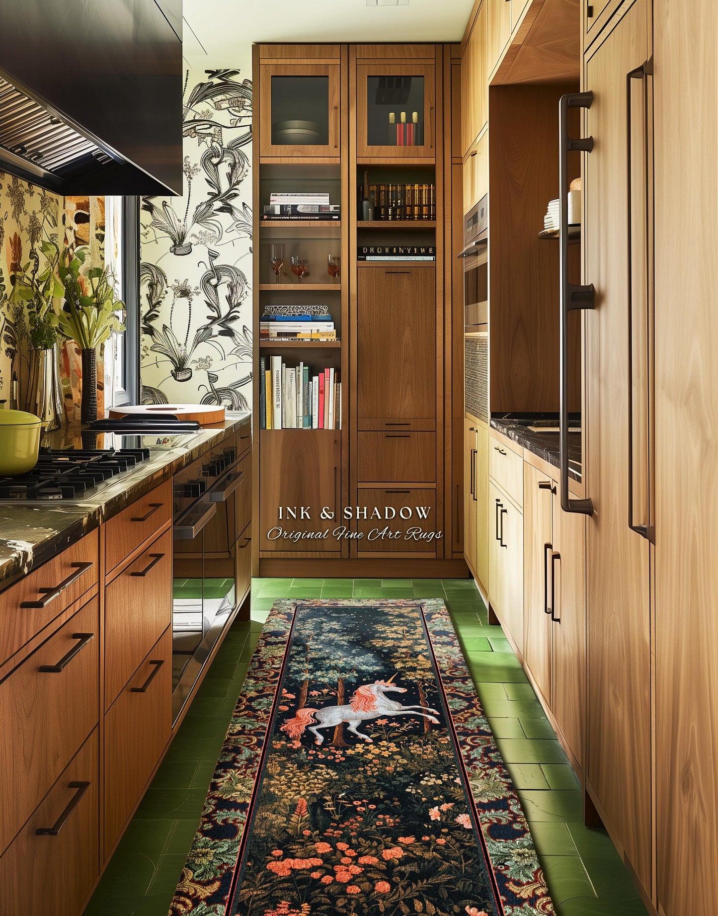 At Ink & Shadow, we approach each rug as a canvas, blending classic design traditions with the captivating charm of the unconventional. Drawing inspiration from 🕯️ Victorian Gothic influences, 🌿 Vintage Botanical Motifs, and 🦋 Woodland Whimsy, our collection aims to capture the beauty of nature’s wilds and the elegance of timeless aesthetics. From our best-selling medieval dragon rugs 🐉 to our captivating floral folk art patterns 🌸 and mystical forest creatures 🦄, we offer a wide selection of one-of-a-kind pieces. Whether you’re seeking something subtle to tie a room together or a bold statement piece to define your space, our over 400 original rug designs bring artistry home in a range of enchanted aesthetics.