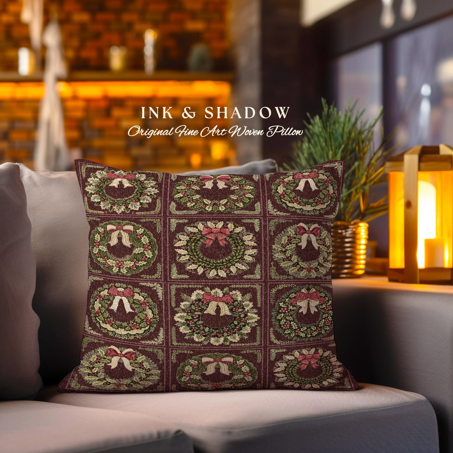 Ornate Baroque Burgundy Berry Wreath Tapestry Pillow Antique Inspired Home Decor | Elegant Festive Cozy Dark Academia Cushion Christmas Gift