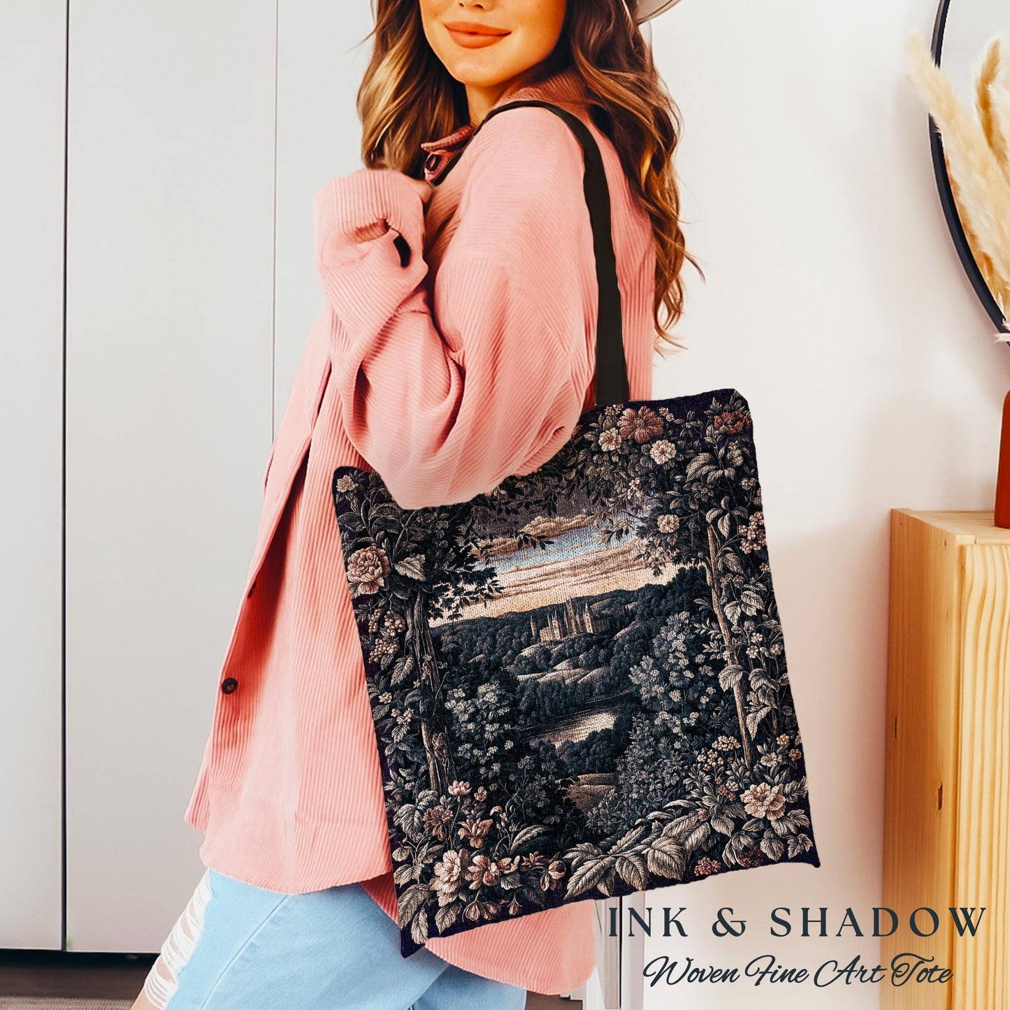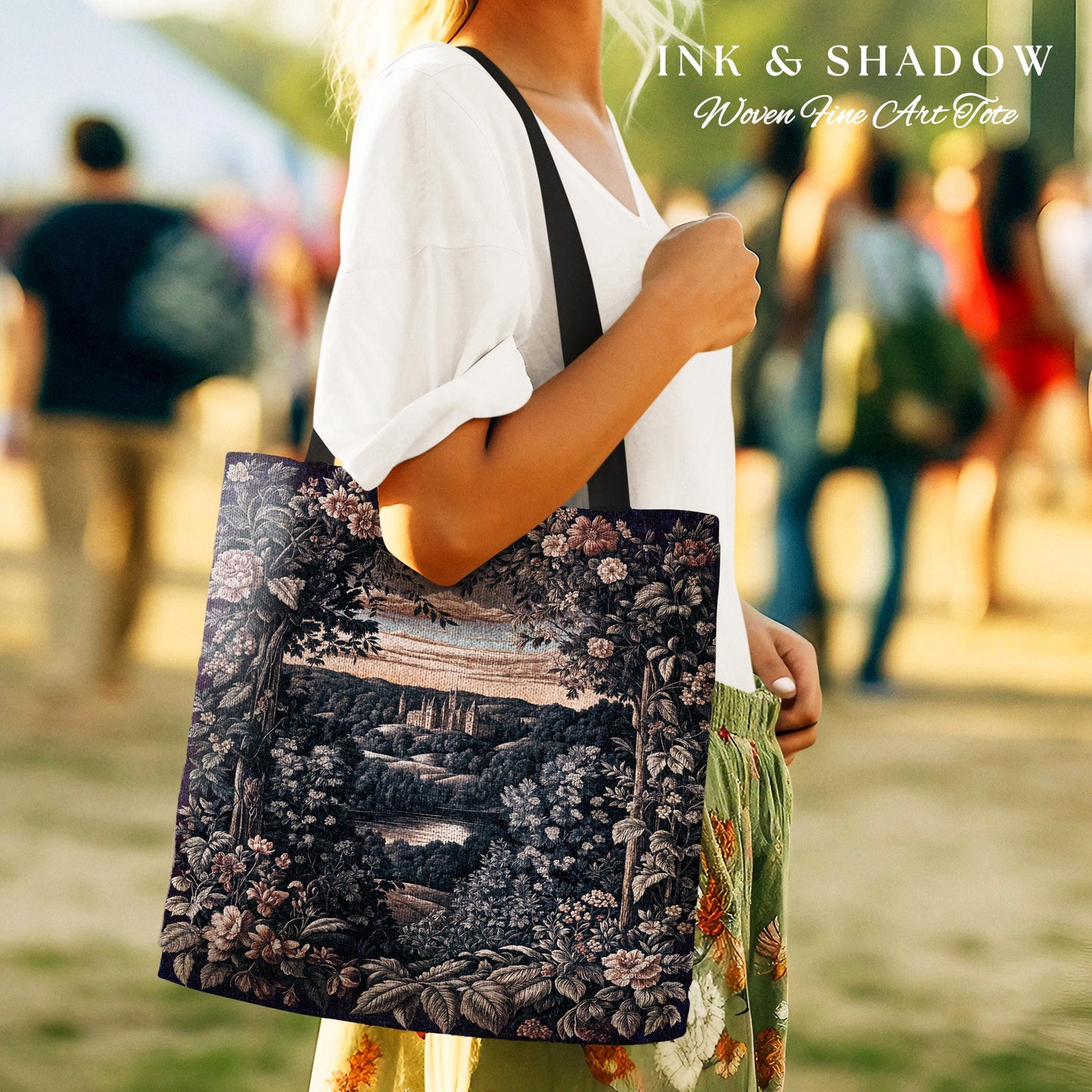 Pastel Fairy Aesthetic Tapestry Bag | Ethereal Woodland Royalcore Rosy Woven Tote Bedroom Botanical Landscape Medieval Princess Rustic Style