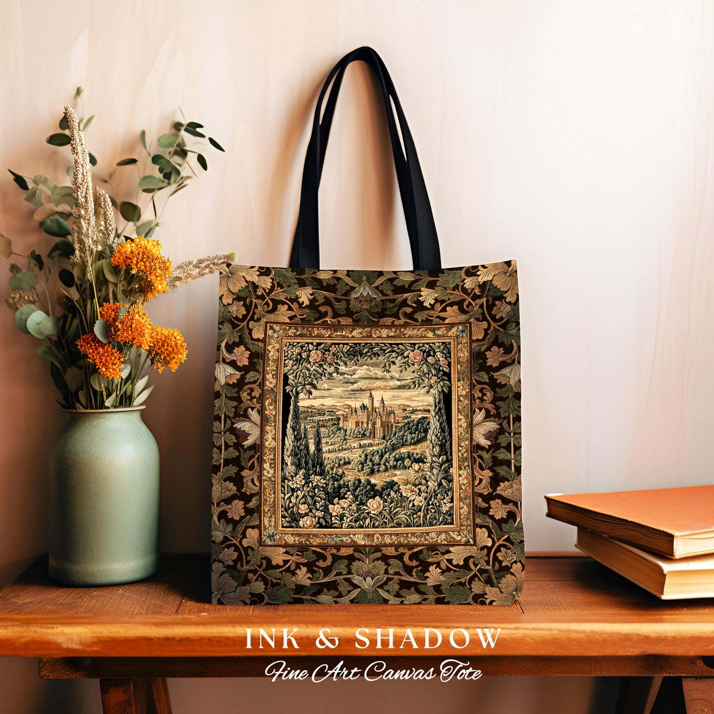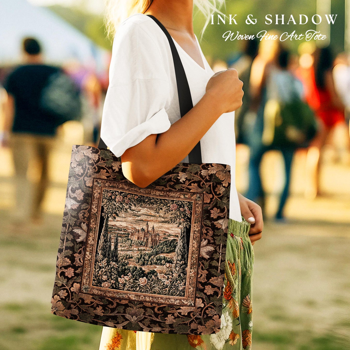 Romantic Victorian Botanical Woven Tote | Medieval Woodland Fairytale Castle Whimsigothic Folklore Everyday Bag Princesscore Victorian Art |