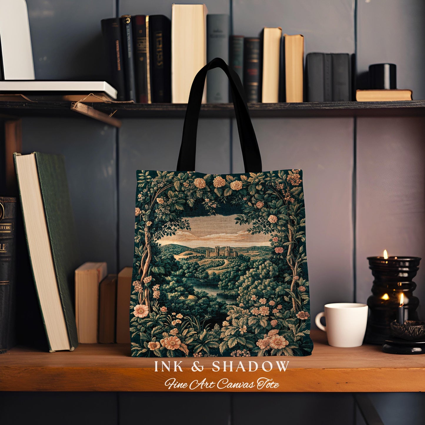 Rosy Forestcore Woven Tote | Woodland Castle Dreamy Ethereal Aesthetic Princess Woodland Medieval Woven Tapestry Bag Bohemian Landscape |