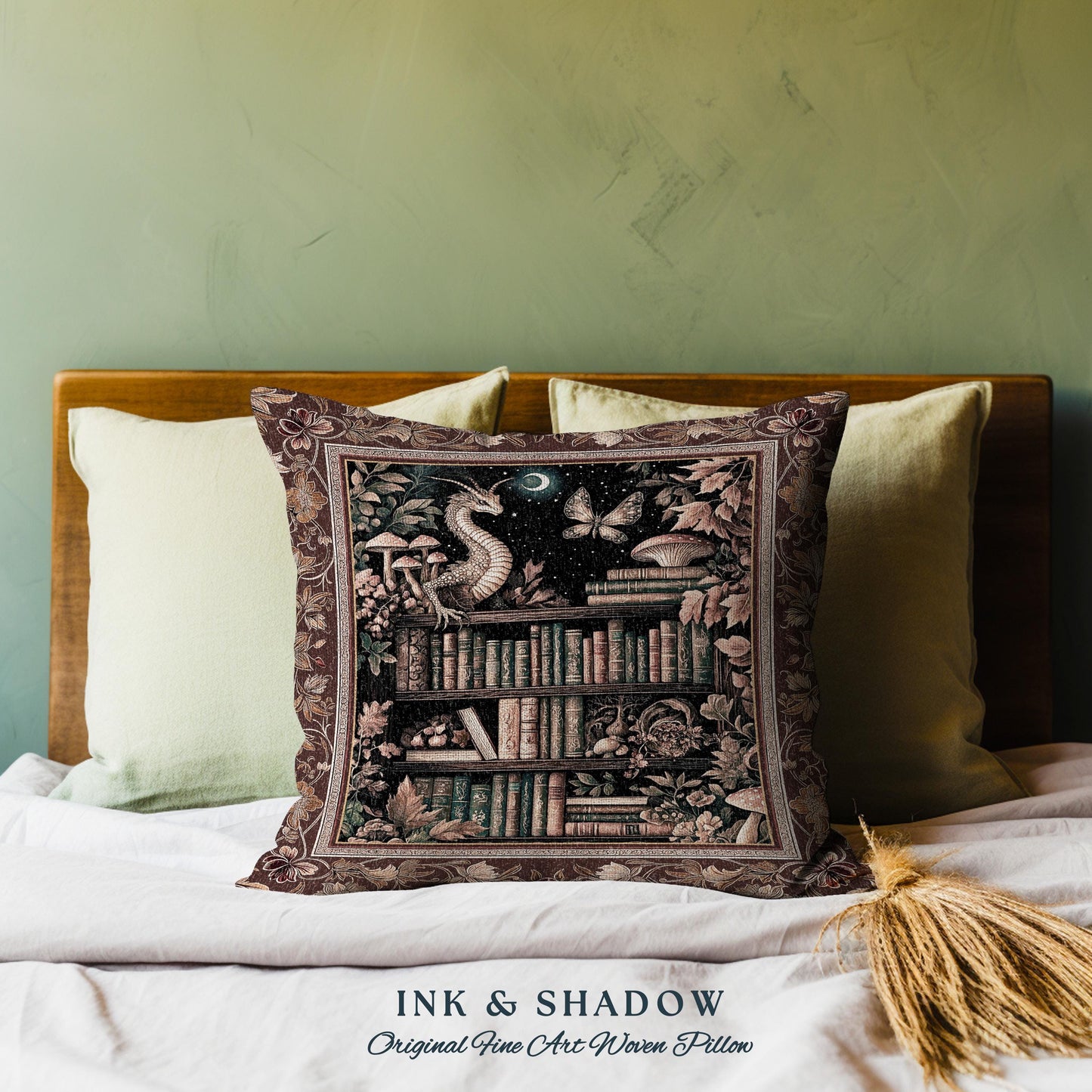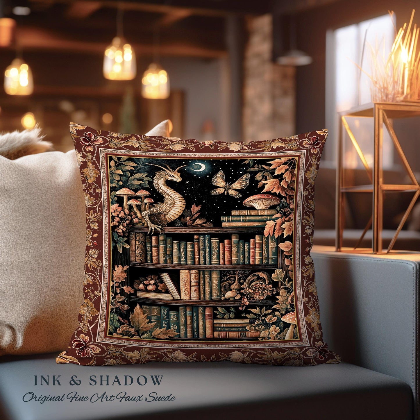 Rust Burnt Orange Woodland Book Nook Magical Dragon Pillow Dark Academia Decor | Goblincore Vintage Folklore Bookshelf Enchanted Art Cushion