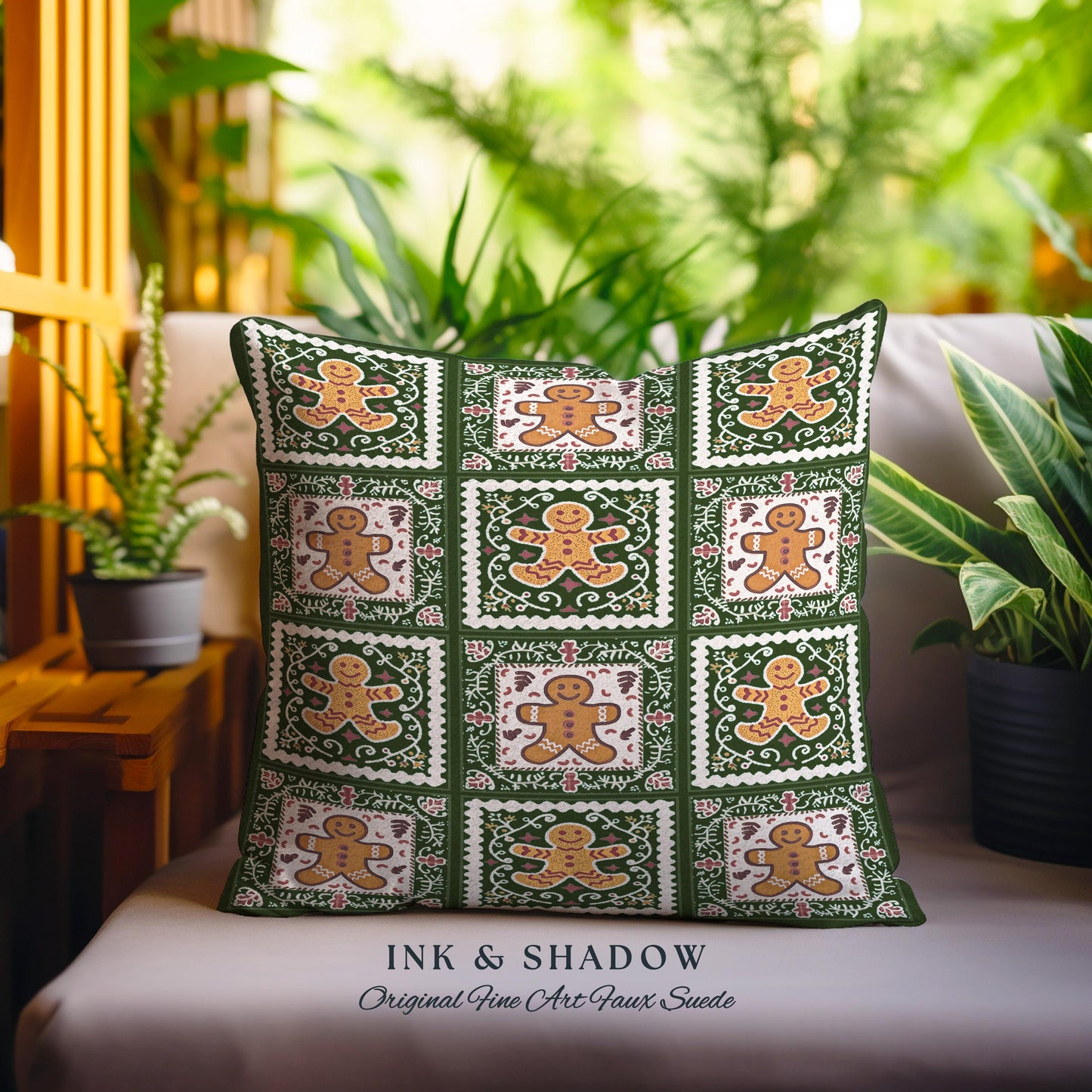Rustic Farmhouse Patchwork Gingerbread Festive Folk Art Tapestry Pillow | Vintage Forest Green Checker Cushion Cozy Christmas Cottage Gift