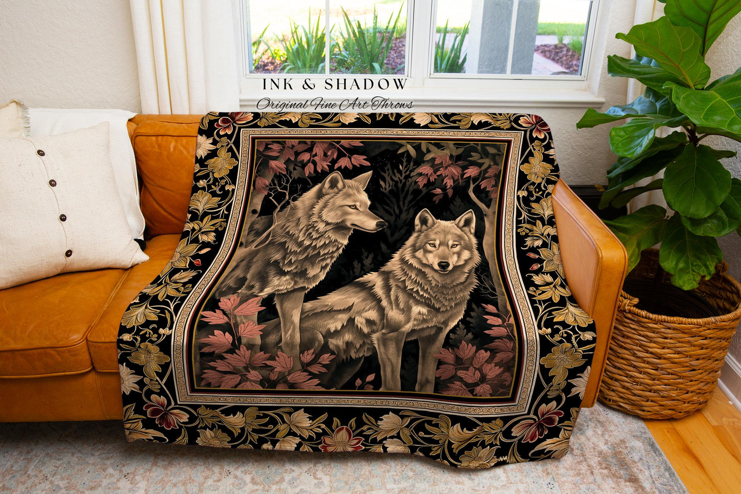 Scandi Woodland Wolf Blanket Nordic Style Whimsical Cottagecore, Victorian Gothic Fairytale Decor Enchanted Forest Wolves Art Tapestry Throw