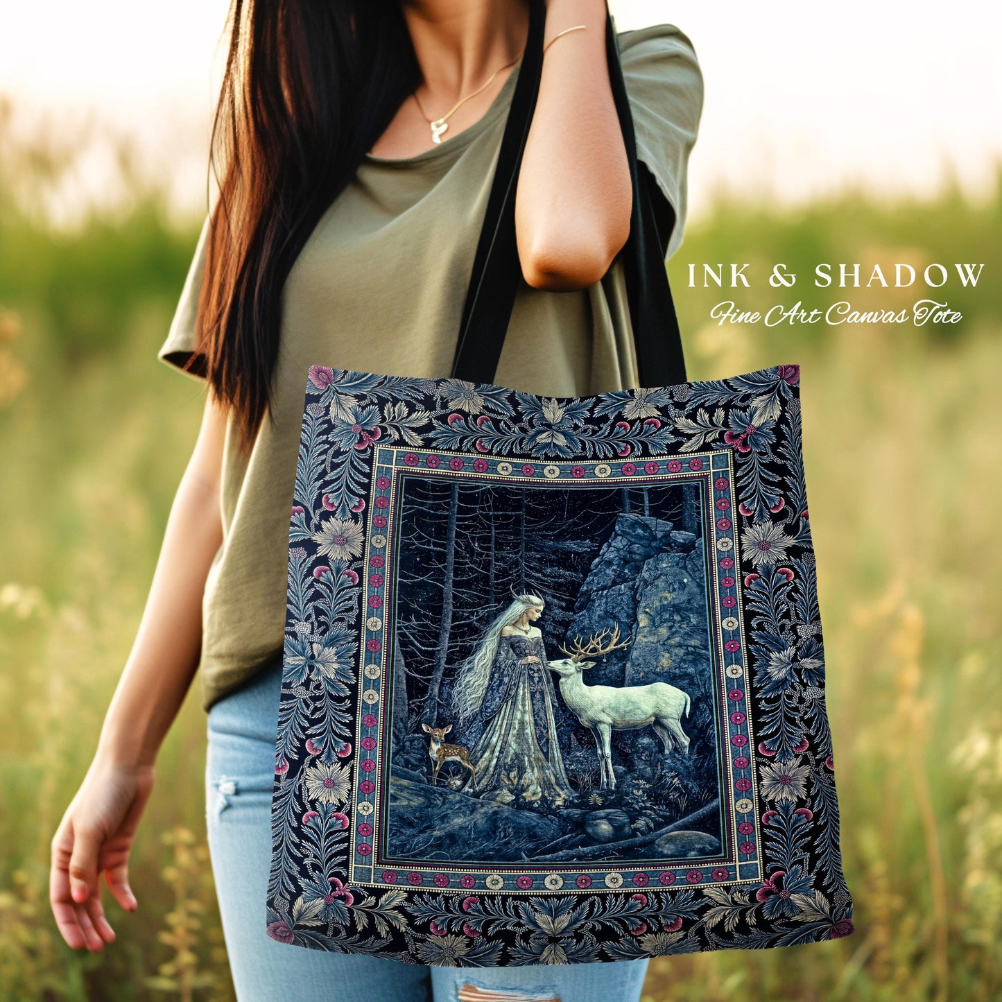 Spirit Animals Ethereal Goddess Tote | Storybook Aesthetic Magical Forest Nymph Fantasy Tapestry Bag Dark Victorian Woodland Deer Moody Art