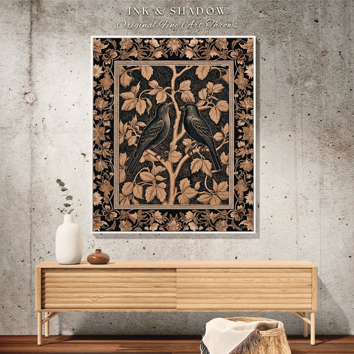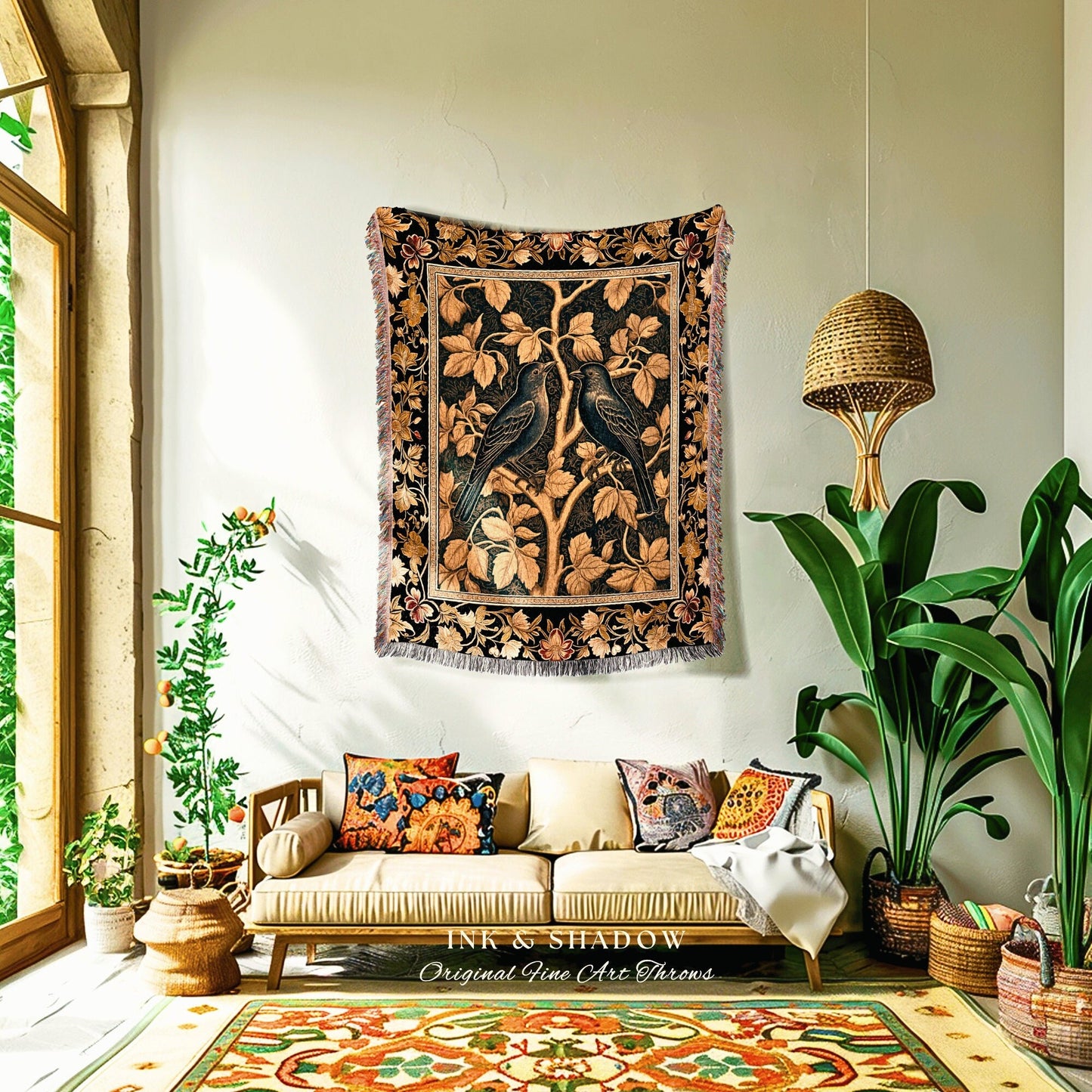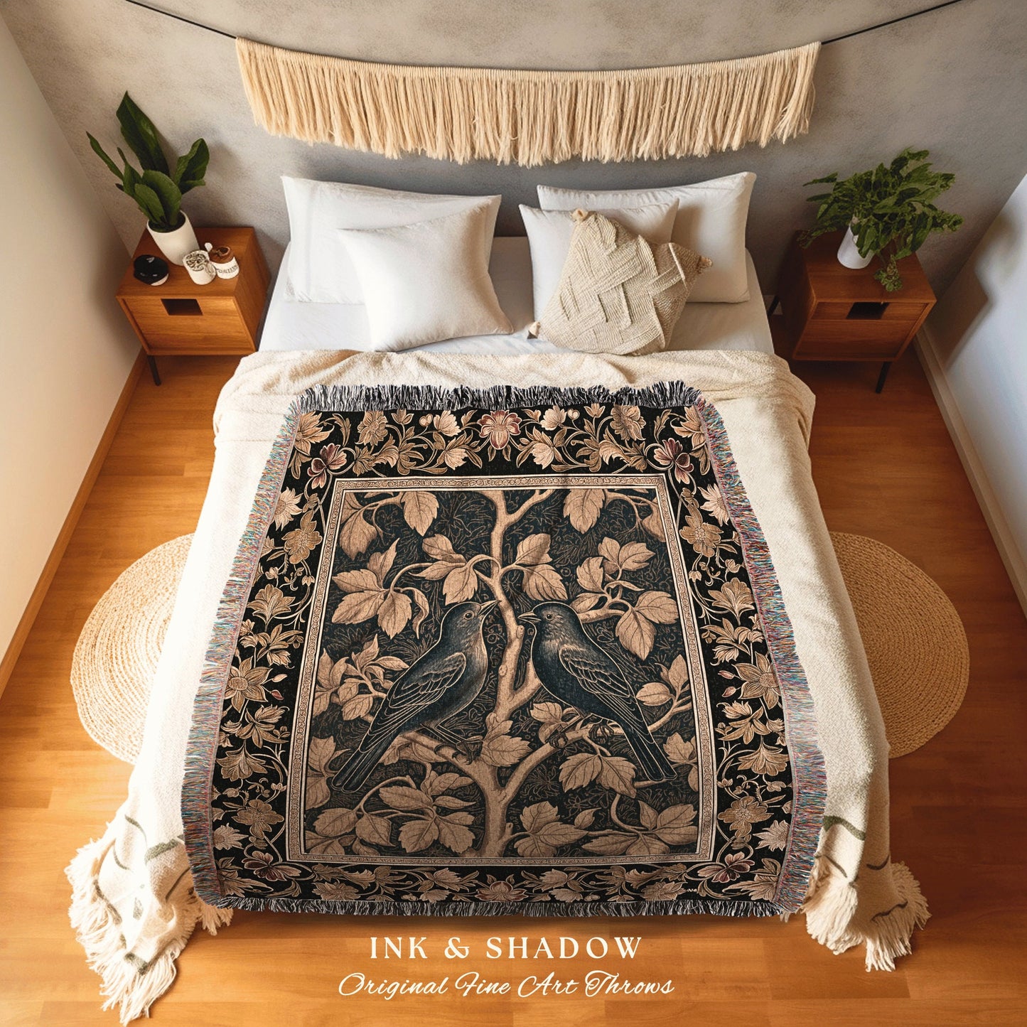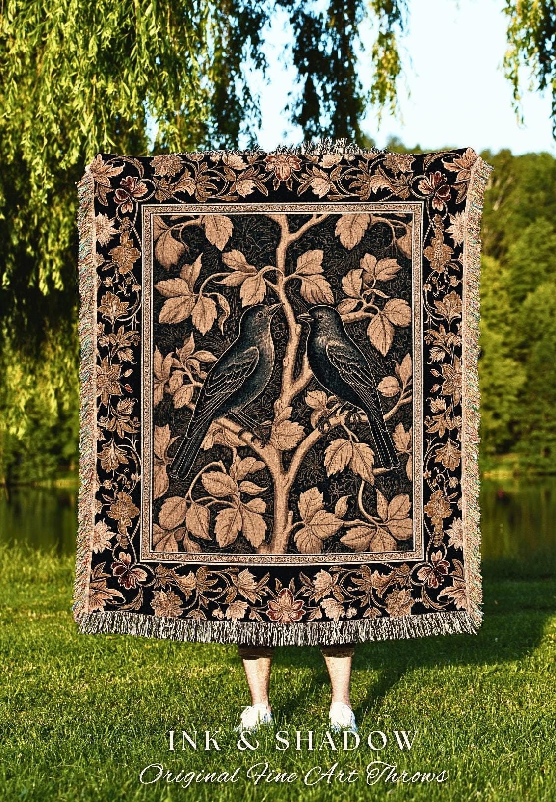 Vintage Fall Aesthetic Bird Blanket Dark Academia Tapestry Whimsigoth Dark Cottagecore Woven Raven Art Crowcore Floral Victorian Goth Decor