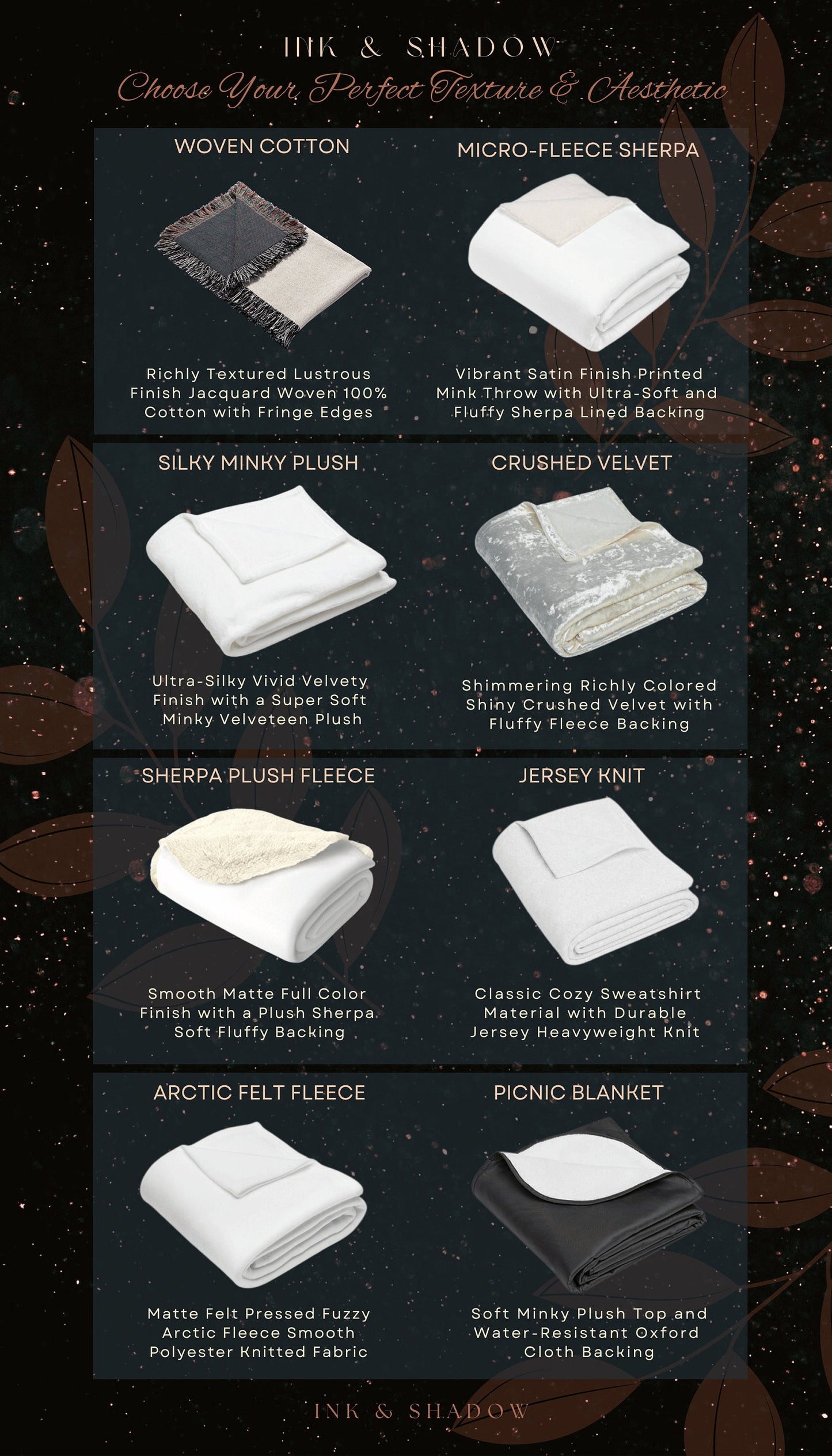 Welcome to Ink & Shadow, where artistry and mystique converge to create a truly enchanting shopping experience. Explore our curated collection that embraces the darker side of beauty, featuring a tapestry of artistry, unconventional curiosities, and hauntingly exquisite treasures. Specializing in bespoke nostalgia, Ink & Shadow blends timeless elegance with whimsical charm to offer distinctive fine art, refined home decor, chic accessories, and sentimental gifts. From luxurious throw blankets and intricately designed rugs to woven wall tapestries, museum-grade printed wall hangings, decorative pillows, and stylish totes, each piece is thoughtfully designed and made to order, ensuring it becomes a cherished addition to your home or an unforgettable gift for a loved one.