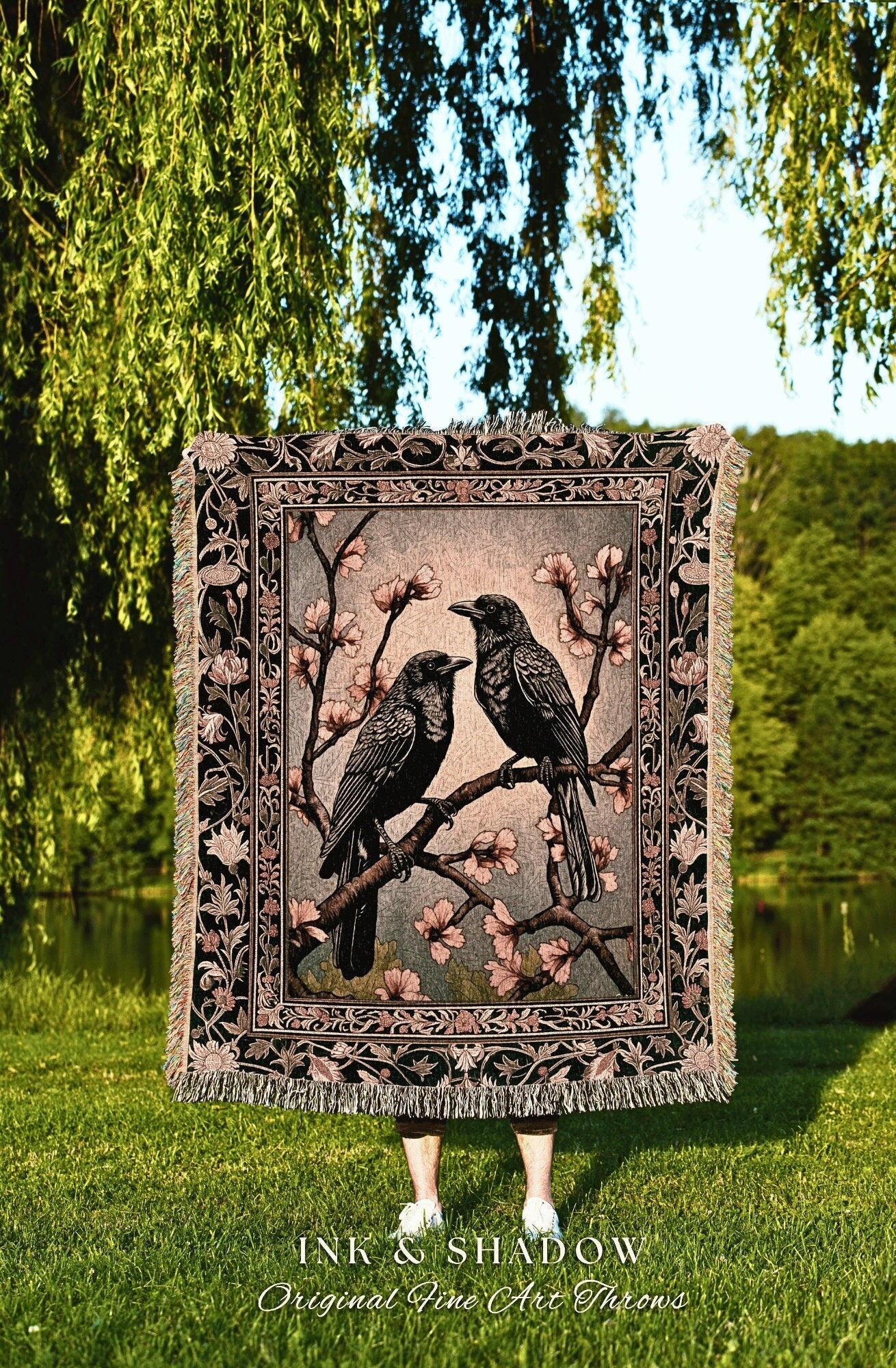 Whimsical Light Academia Raven Throw Cottagecore Crowcore Grunge Fairycore Woodland Gothic Woven Tapestry Floral Vintage Crow Aesthetic