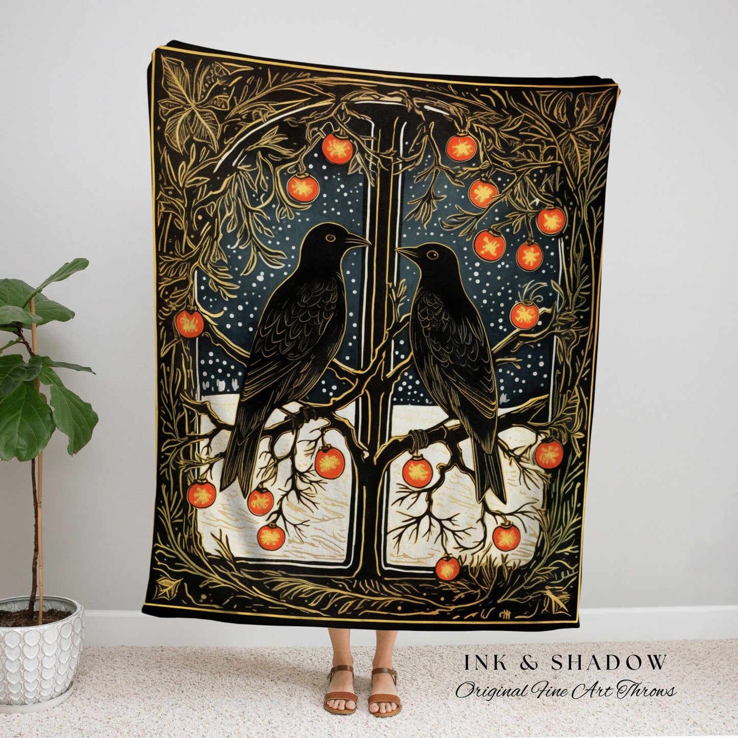 Winter Crow Blanket Vintage Christmas Decor Tapestry Whimsigoth Blanket | Gothic Christmas Tapestry Raven Decor Crowcore Room Decor Blanket