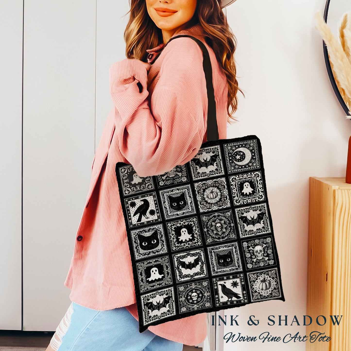 Witchy Aesthetic Shoulder Tote Bag | Dark Cottagecore Gothic Cat Lover Woven Tote Bag Retro Halloween Tapestry Bag Goblincore Gift for Goth