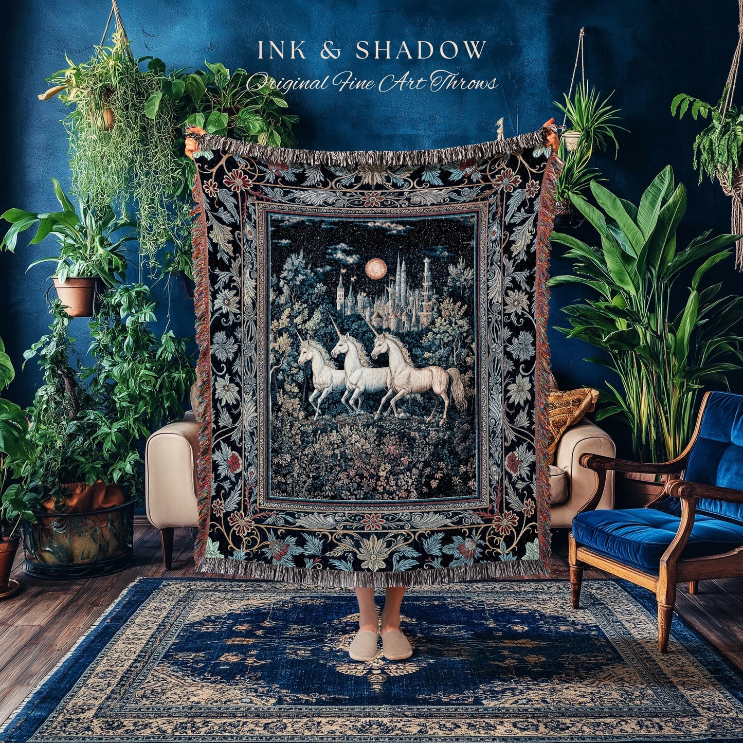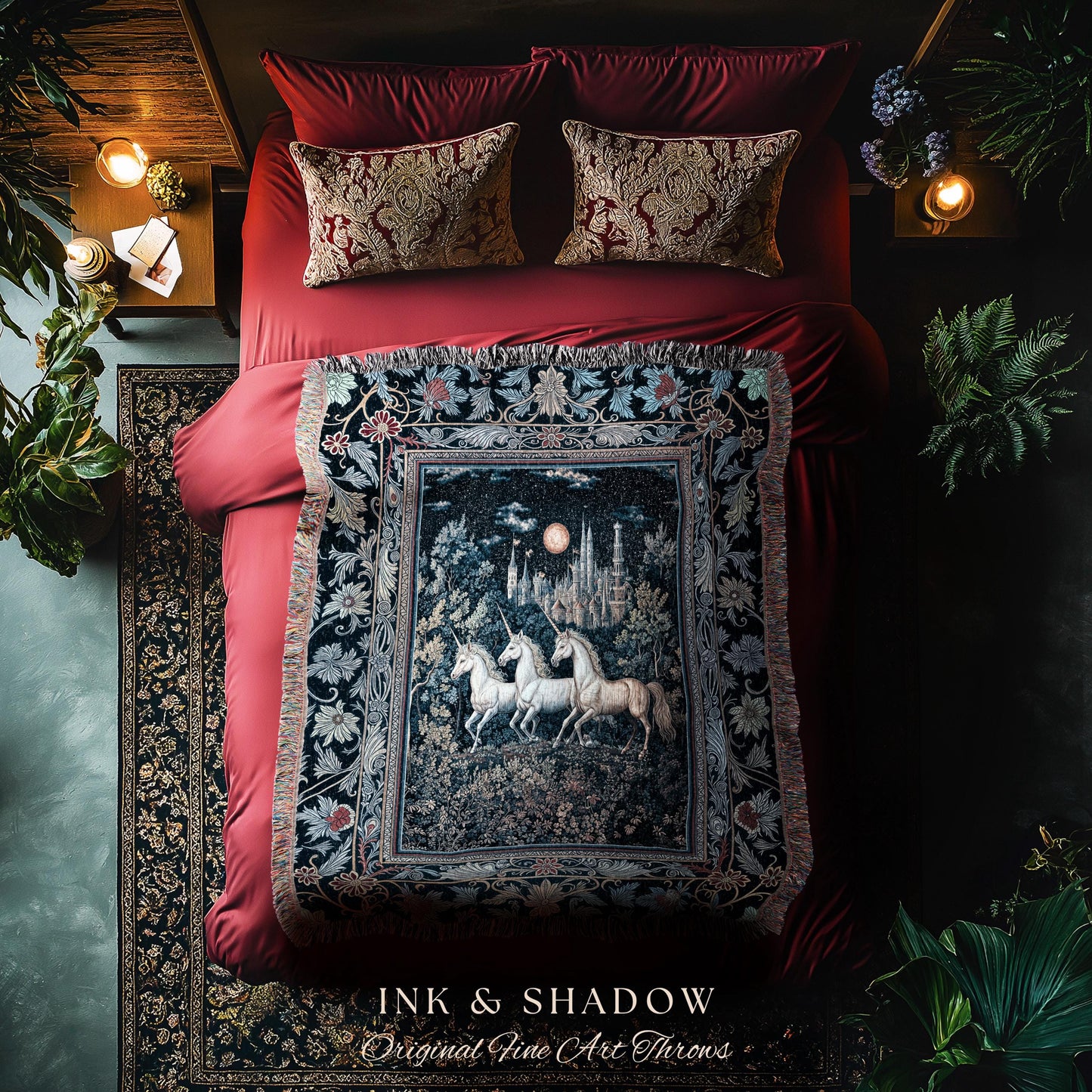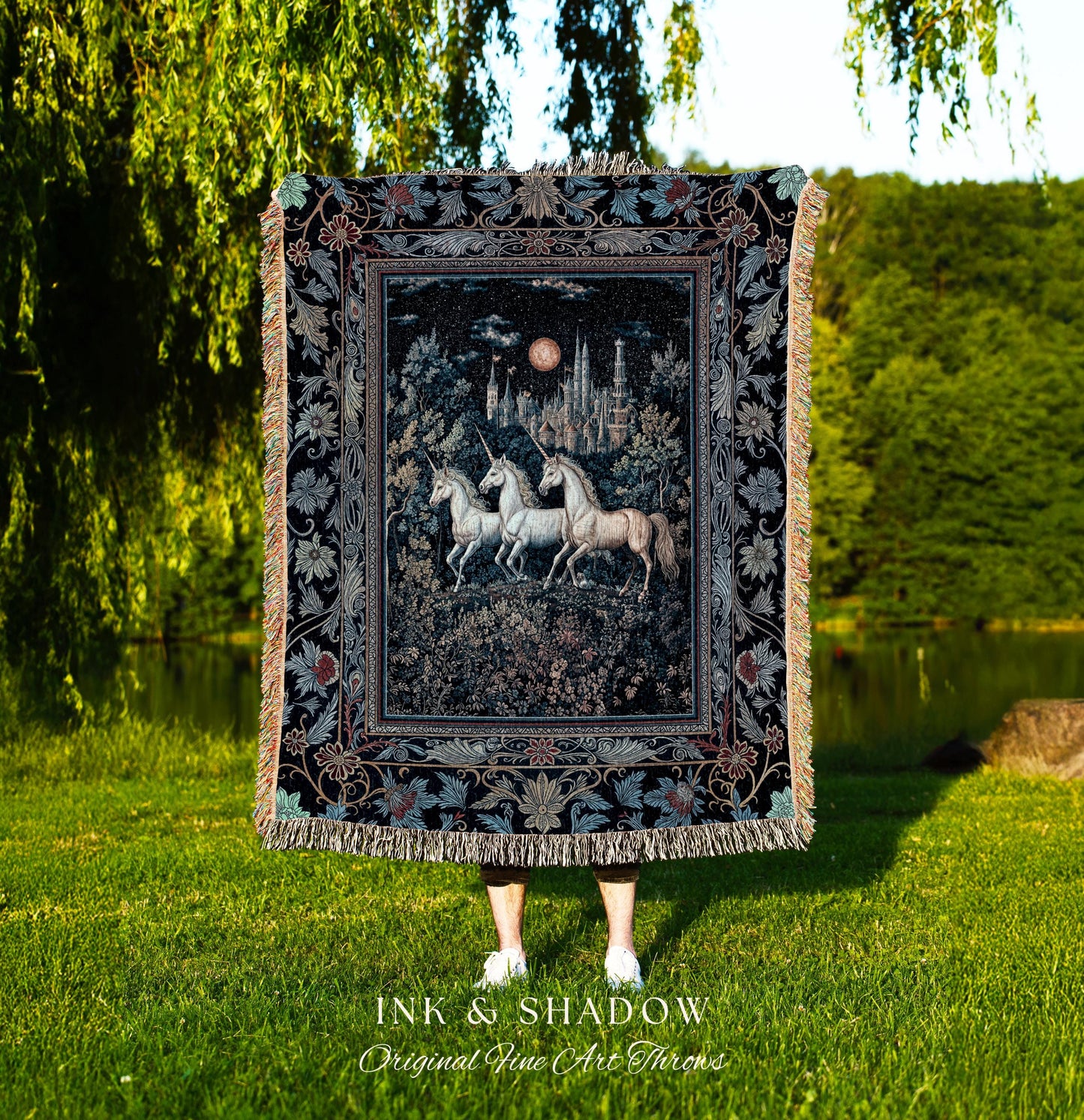 Witchy Dark Romantic Woven Tapestry | Medieval Folklore Decor Fairytale Inspired Cottagecore Whimsical Fantasy Unicorn Throw Blanket Gothic