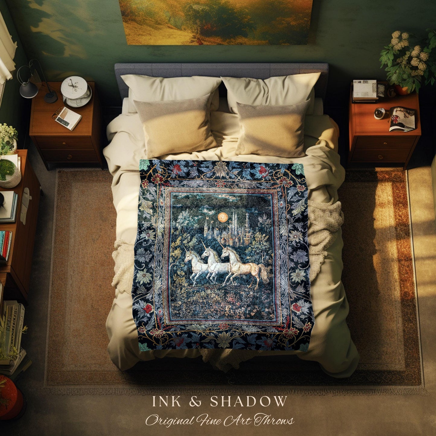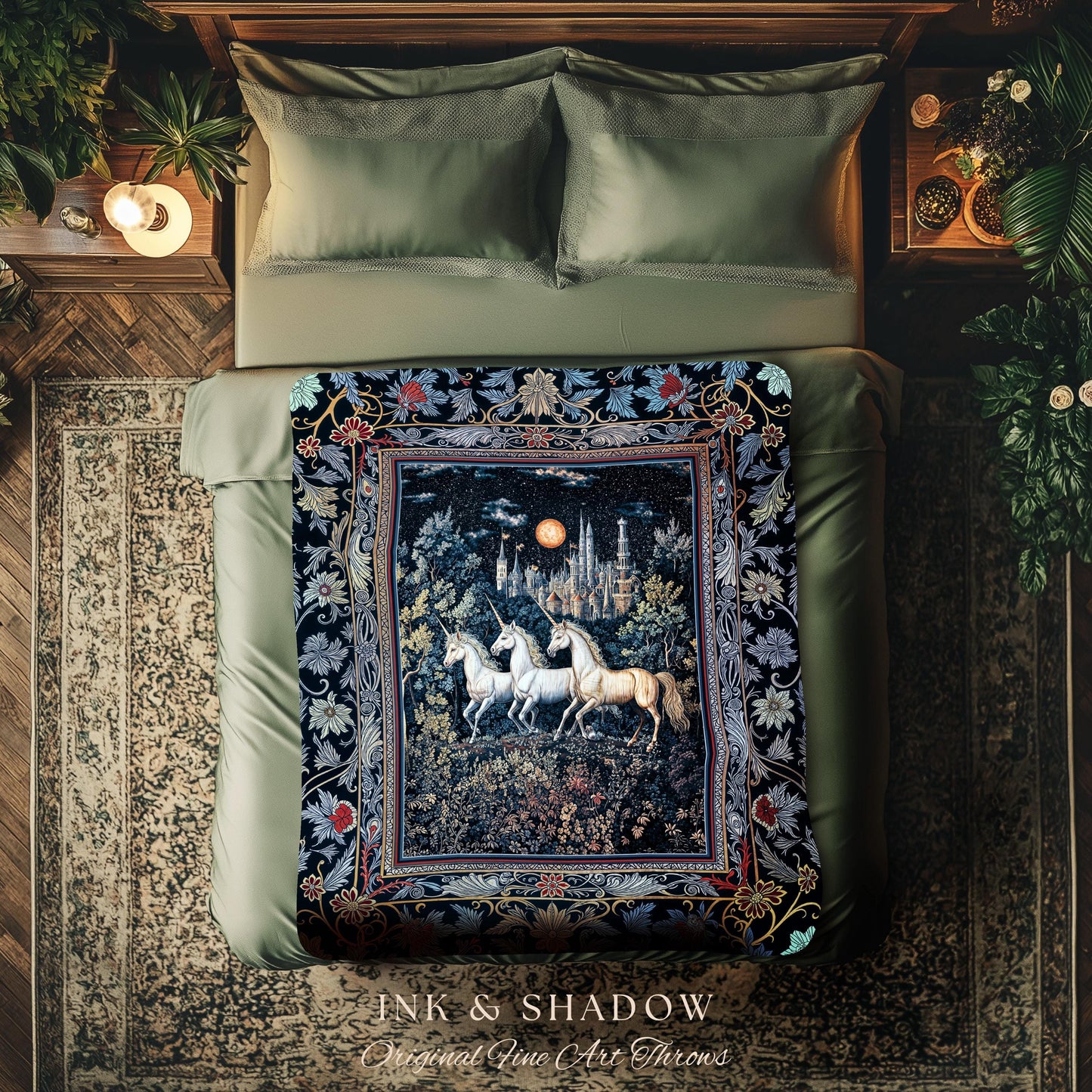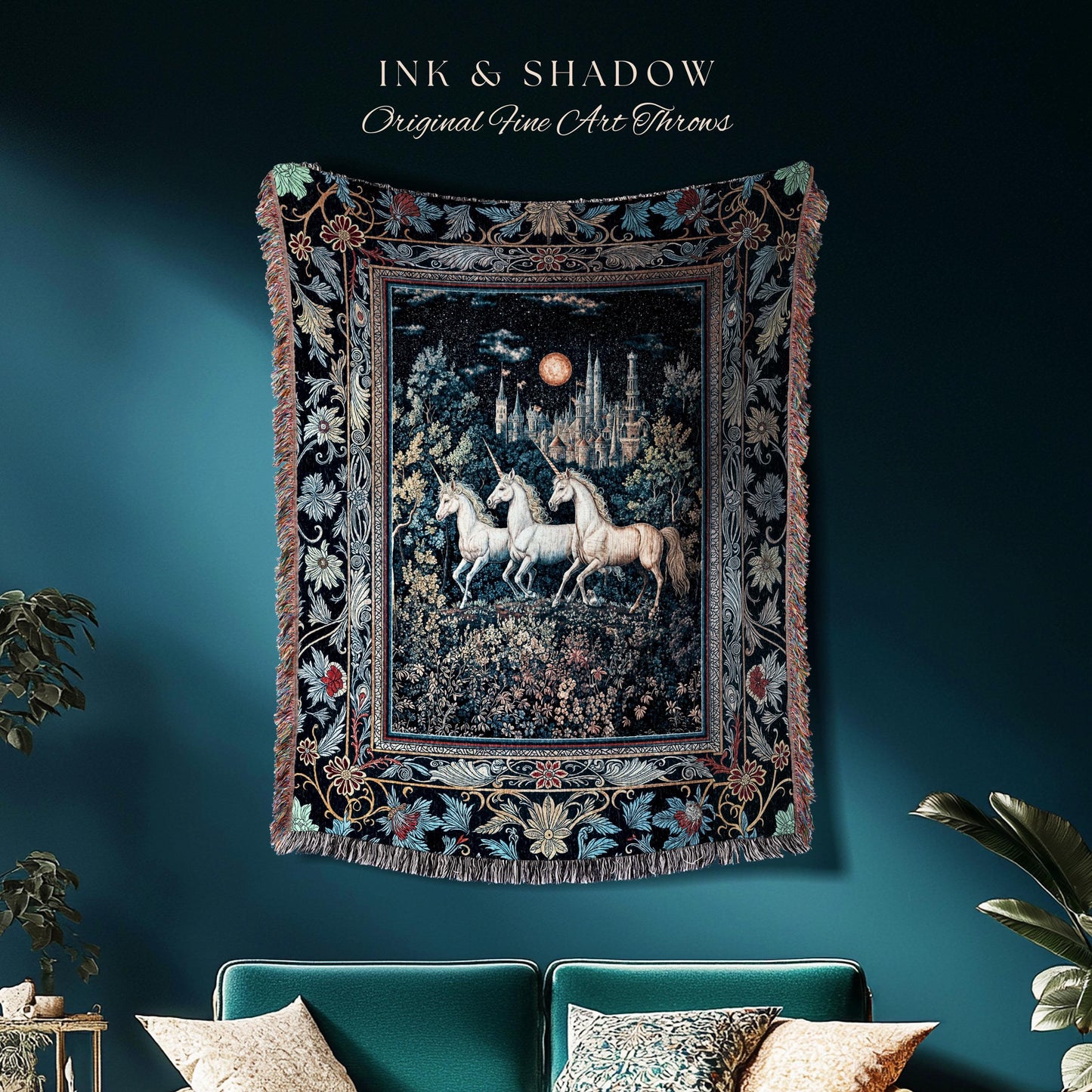 Witchy Dark Romantic Woven Tapestry | Medieval Folklore Decor Fairytale Inspired Cottagecore Whimsical Fantasy Unicorn Throw Blanket Gothic